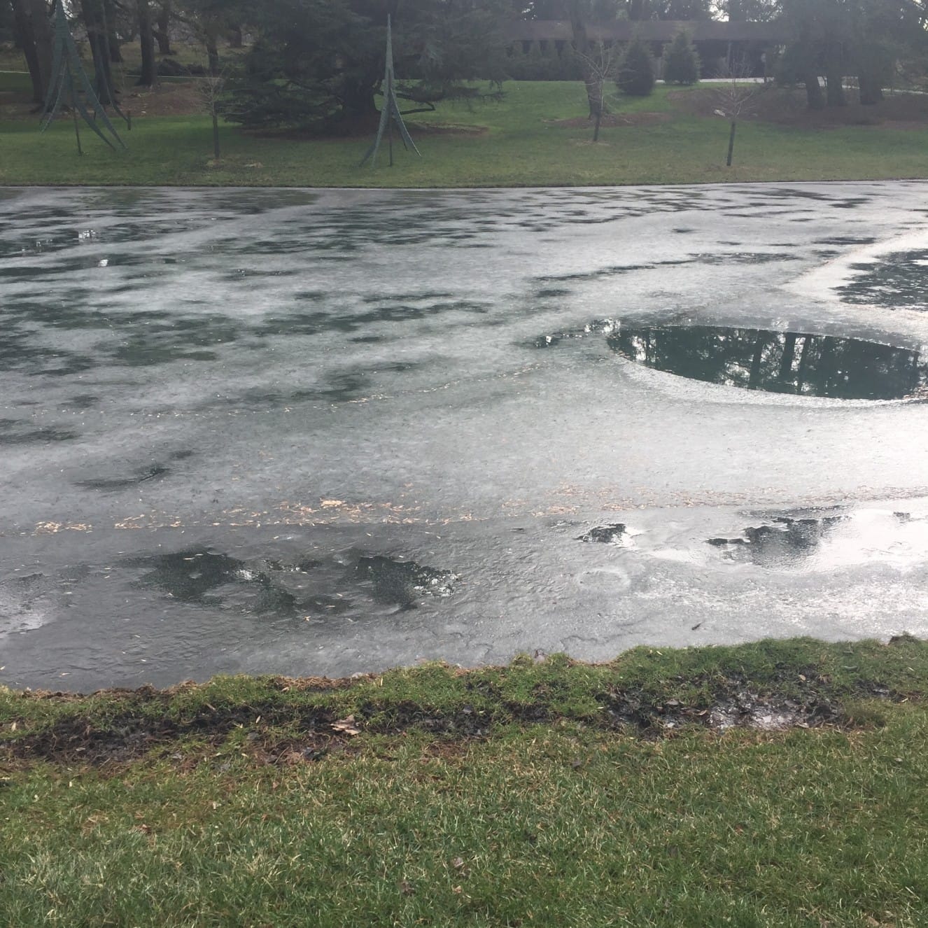 Risk taker Geese slowly skidded to the edge of the ice for a cold drink.