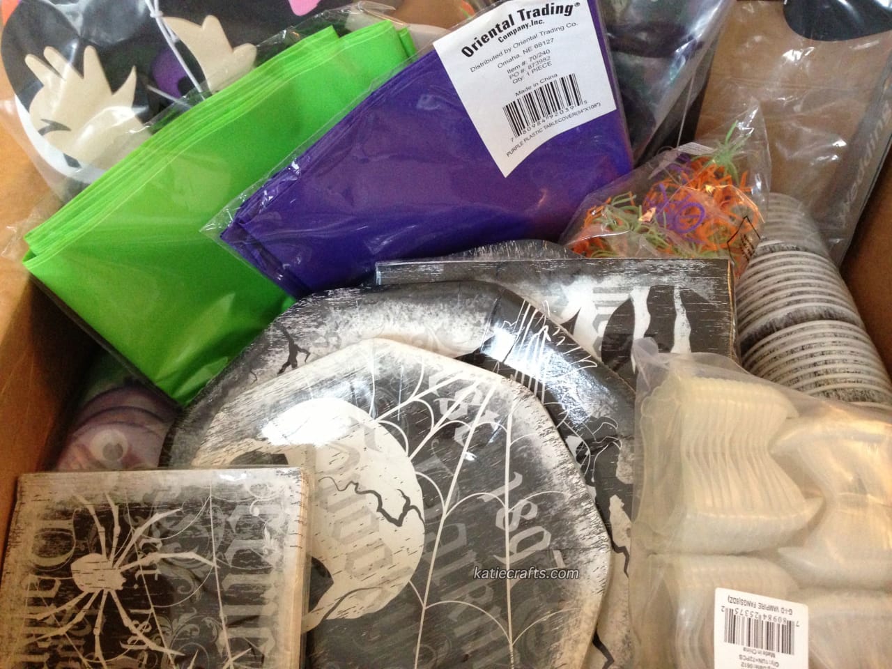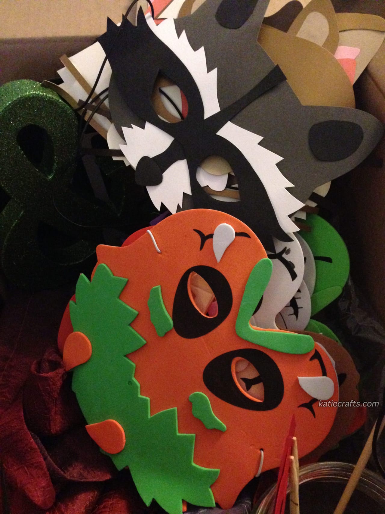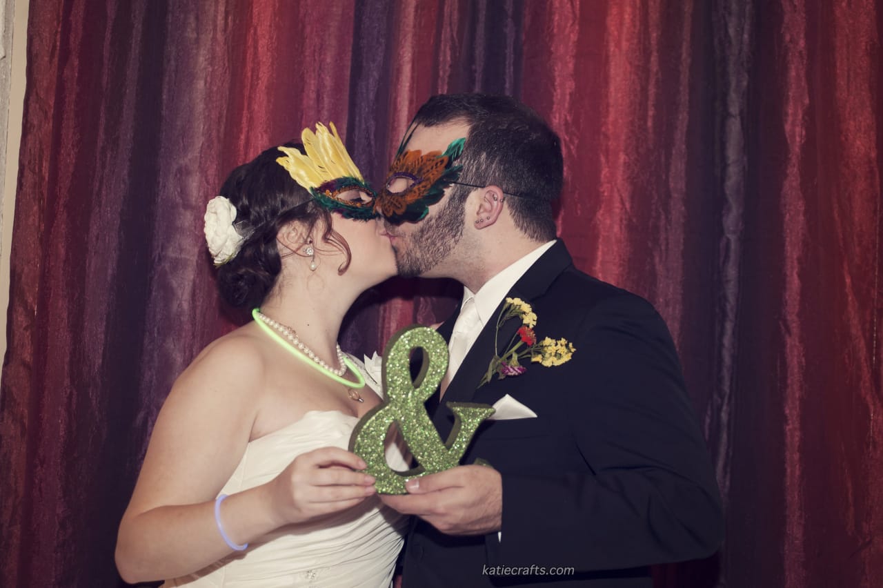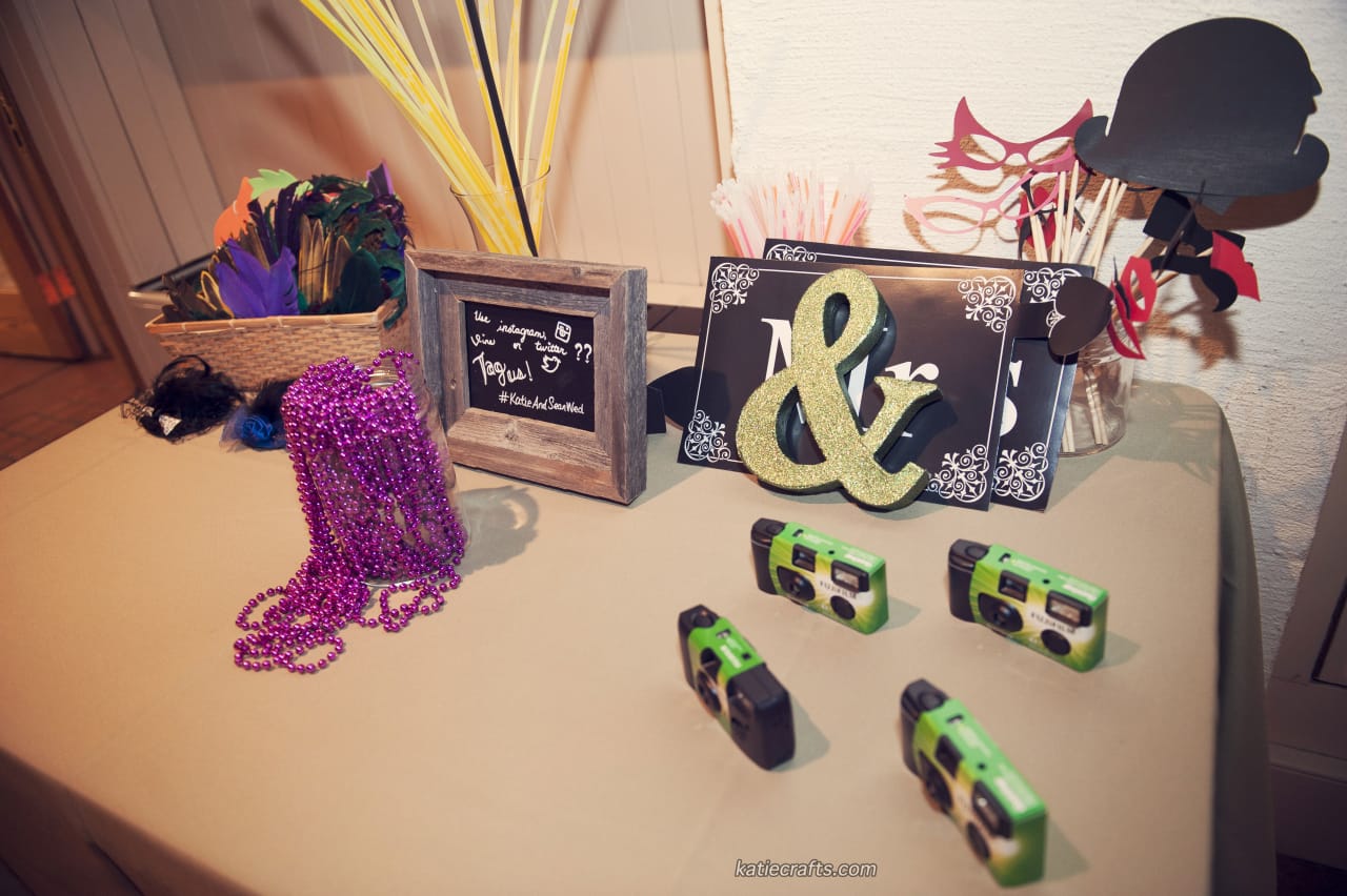 The DIY ‘photo booth’ was a simply hung curtain near a table, which was home to more disposable cameras, Halloween masks, beads, hats, glow necklaces and signs.