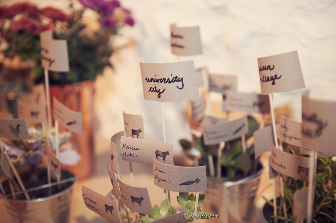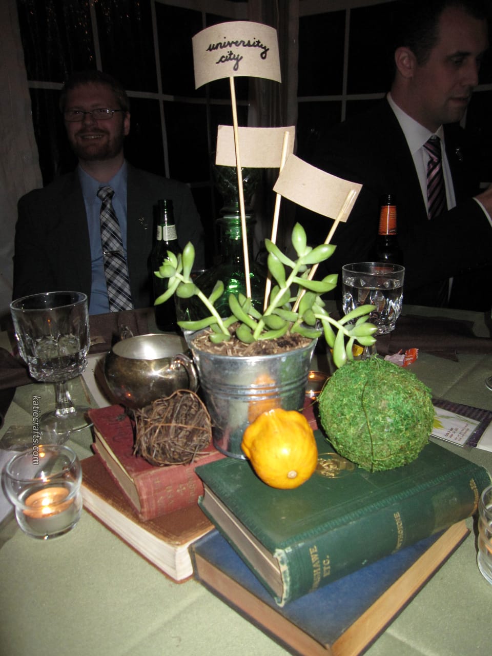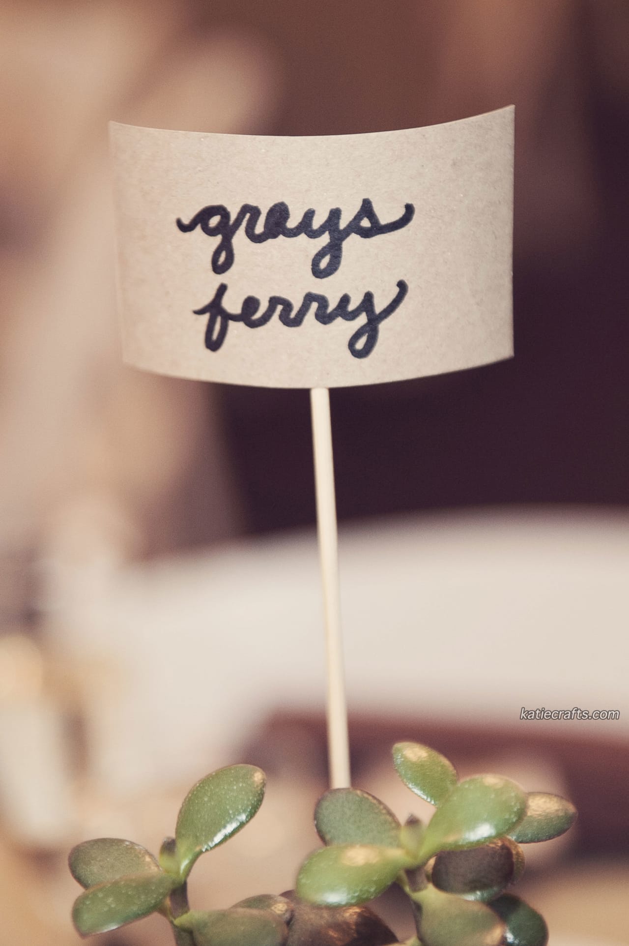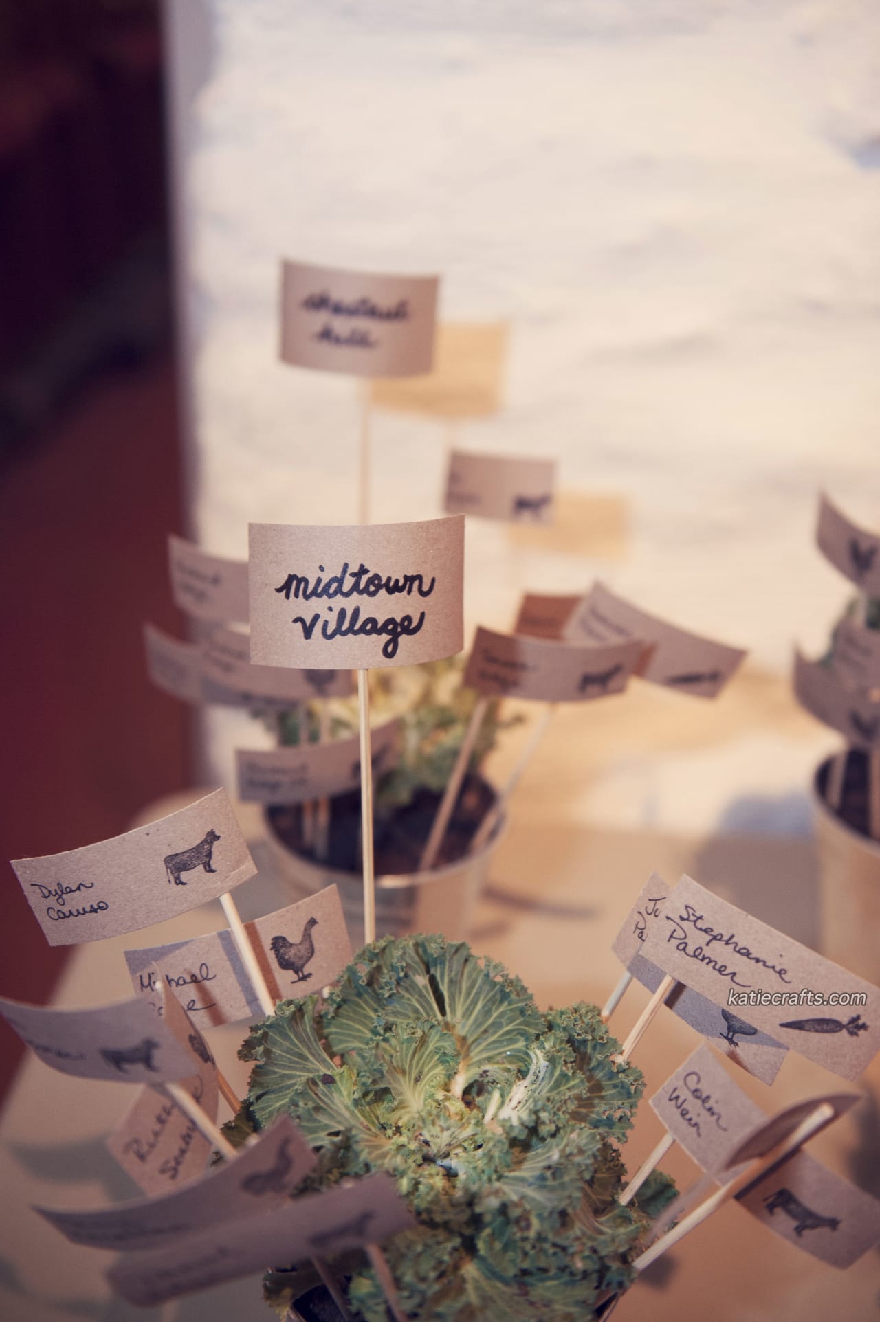 The table numbers were table names, each a different part of Philadelphia. They, along with guests names, were housed in flag form, sticking out of different potted succulents and herbs/veggies.