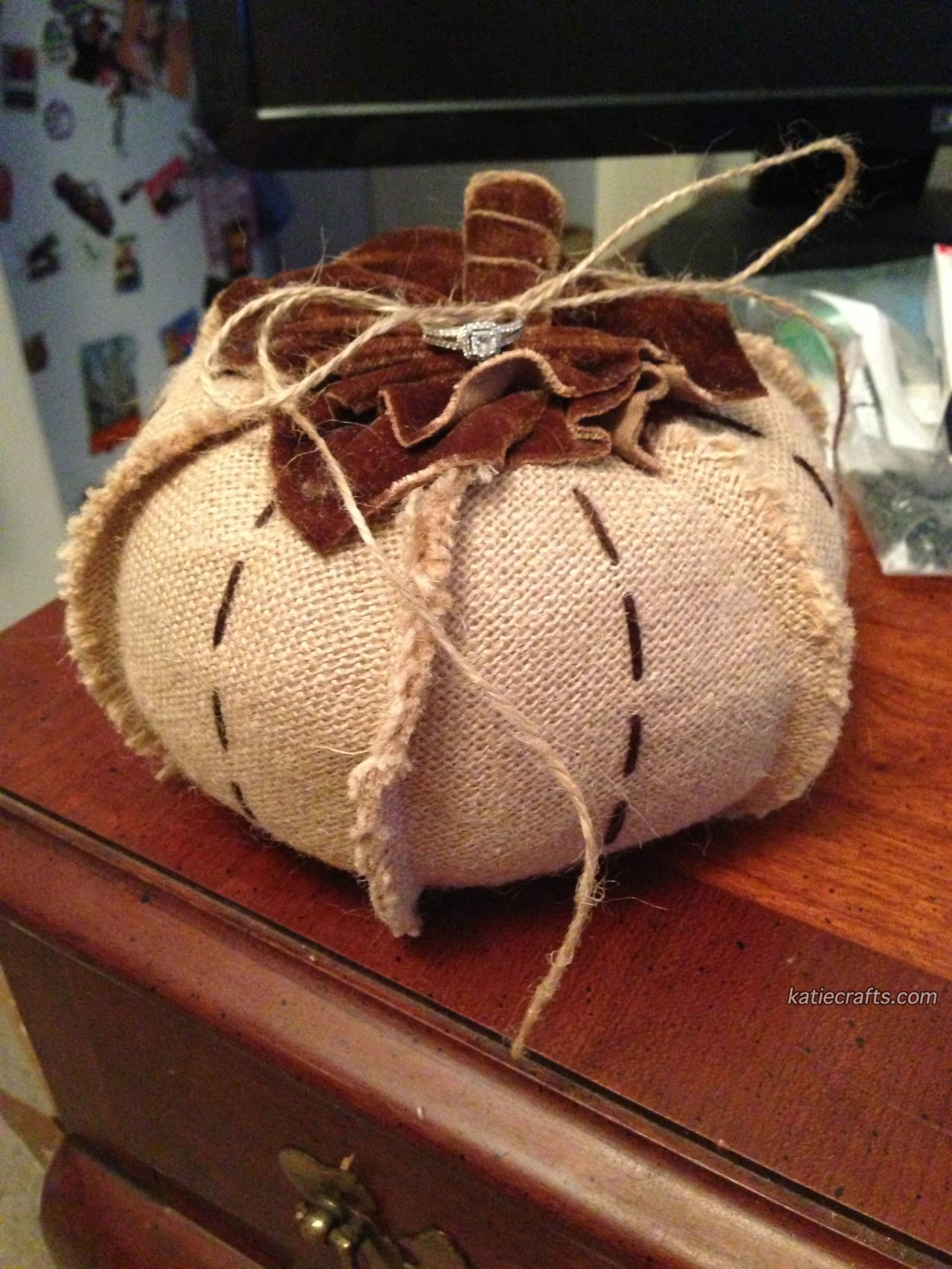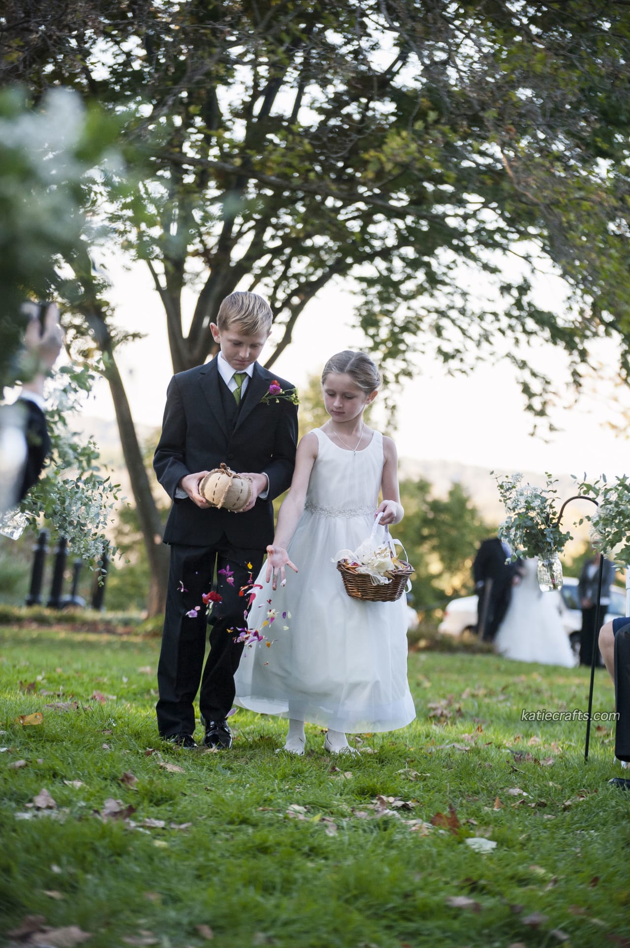 The ring bearer’s pillow was a pumpkin I sewed twine to to hold the rings, while the flower girl’s basket was wrapped in ribbons and silk flowers.
