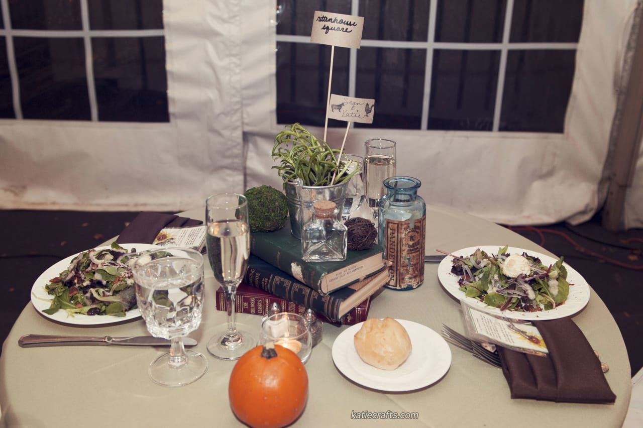Each and every tablescape was unique: a collection of various old books, pumpkins, candles, balls, plants and more. Each table had a disposable camera on it with it’s own version of “I SPY” so that no two photos would be the same. We haven’t developed these yet!! Hopefully for our two year anniversary we will!!! (Need ideas for your own I SPY game? Here are the lists we used for ours!)