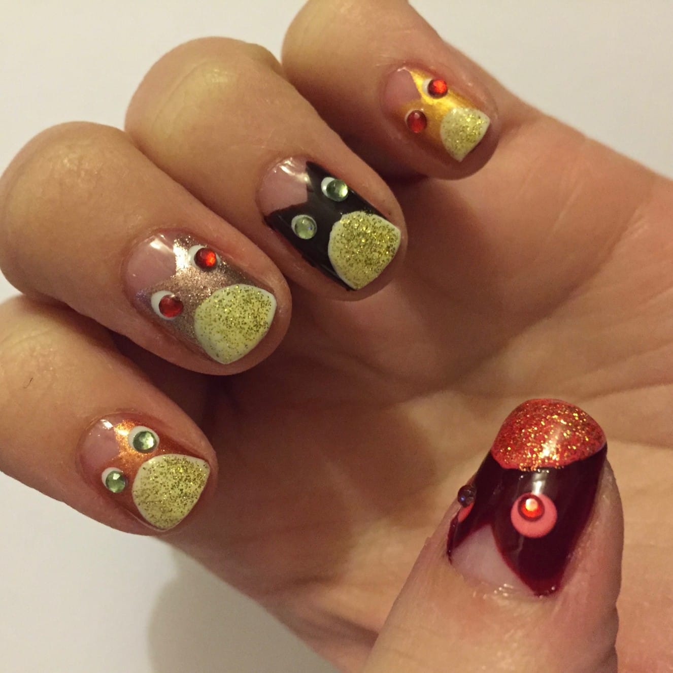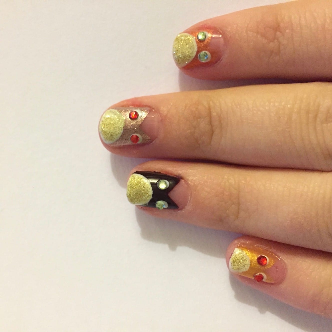 - When all the polish is all dry, paint clear top coat on each nail one at a time. As soon as you’ve painted a nail clear and it is still wet, place your gems on the white eyes so they stick. Then move on to the next. Painting clear on TOP of the eyes definitely makes them stay a lot longer, but it takes away some of the sparkle of the rhinestones, so for this tutorial I did not do that. You may, however!