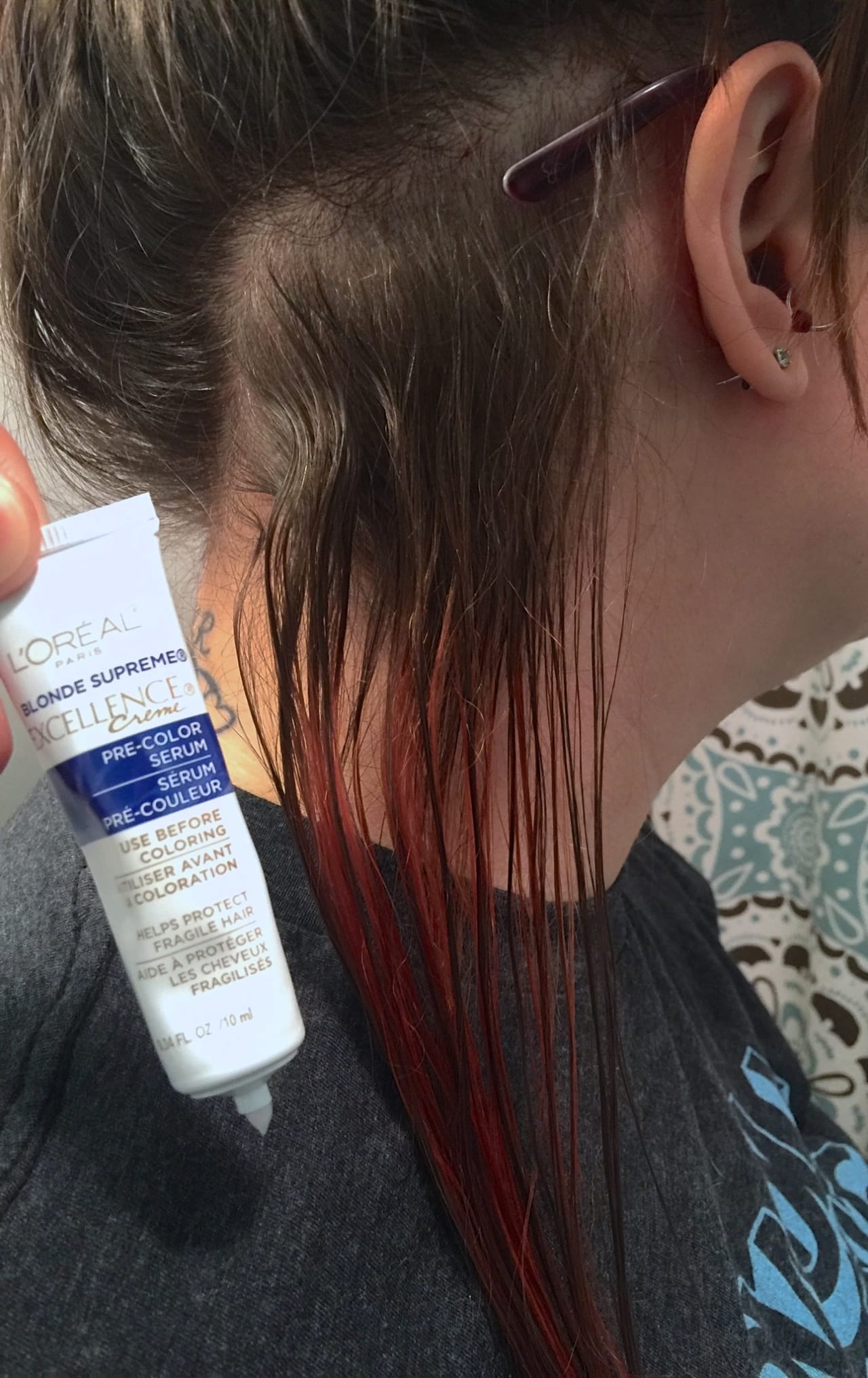 - I parted my hair for the strip I wanted colored and put the rest up in a messy bun, so it was away from the section that would be dyed. Then I applied the pre-color serum that came with my box.