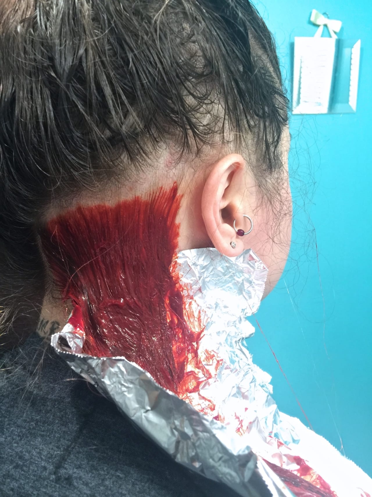 - When finished, once again fold/crumple up the foil, remove gloves, set timer and wait however long the brand recommends! Keep your towel around your shoulders and be sure to NOT LEAN ON ANYTHING during this time! You don’t want to ruin your couch, pillows or cat because you leaned on it with dye. Additionally, remove your glasses, even if you don’t want to. I dyed the very tip of mine a little red. Whoops.