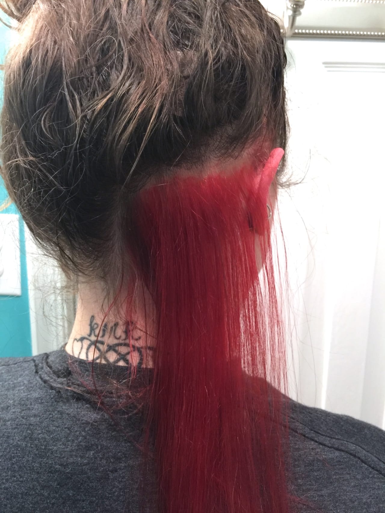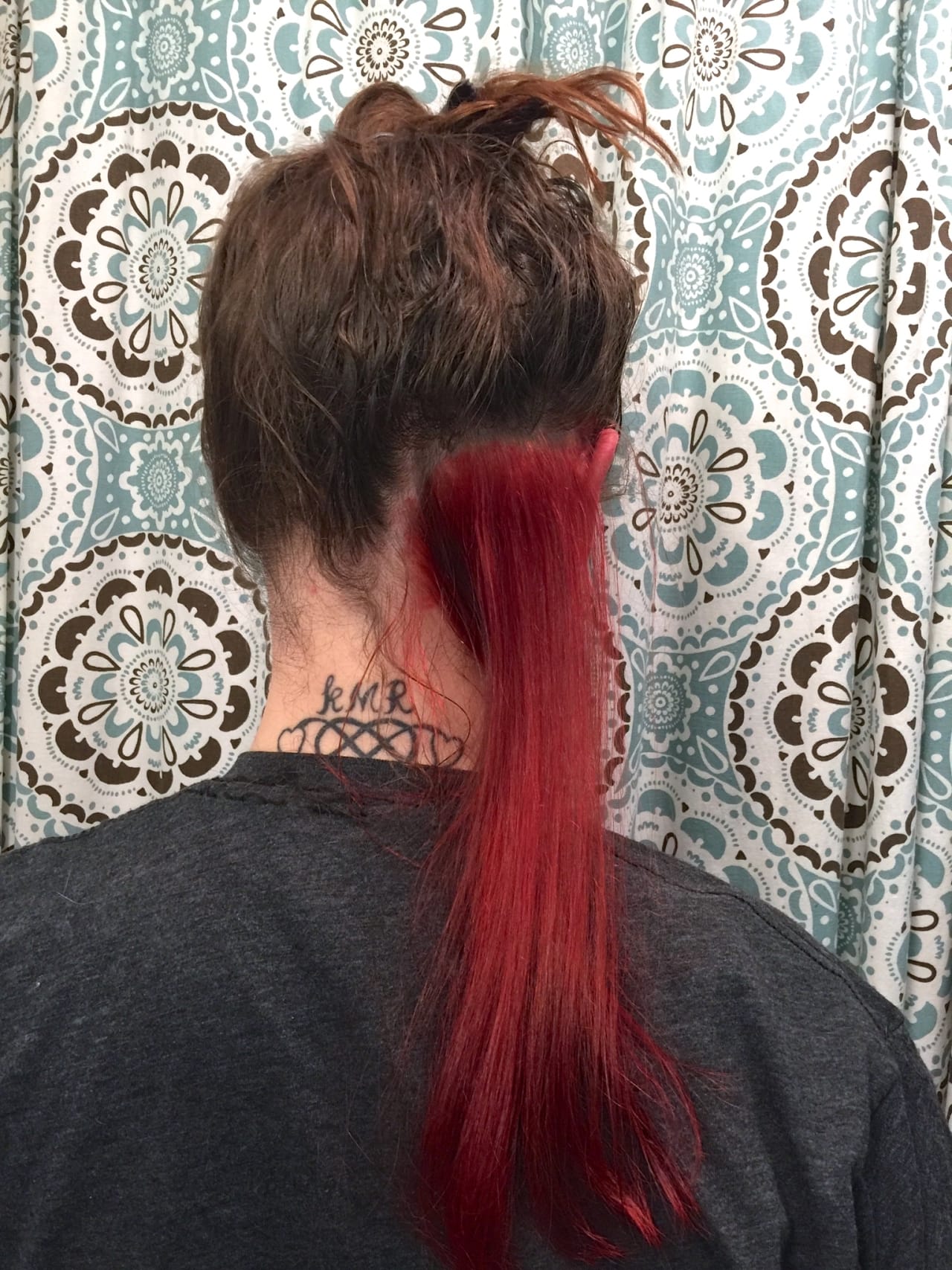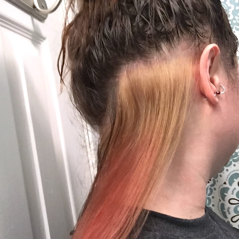 Once I got engaged a few years ago, I dyed my hair back to regular old brunette, so that by the time the wedding rolled around, my roots wouldn’t be showing as much and I’d be pretty much my natural color (who knows what that is at this point!) When the wedding was all said and done, I decided I really wanted to bring back some of the fun I used to have with my hair, but dying the entire underneath of it was a lot of work. I’ve always wanted to have an entire head of fire engine red, but I know my roots would show quickly and I’d get too lazy to fix them. That’s why just a single strip of red under my hair that shows when it’s pulled up into a ponytail or bun, but can be hidden with my hair down when the roots are growing back and I haven’t fixed them yet was perfect.