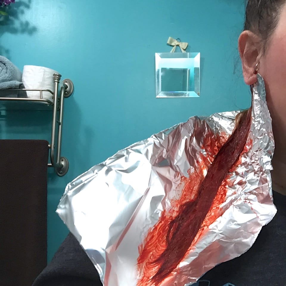 - Fold or crumple the foil all the way up to your scalp and set your timer for whatever the box suggests. Take off your gloves carefully (you’ll use them again soon!) and go write a blog post while it sets.