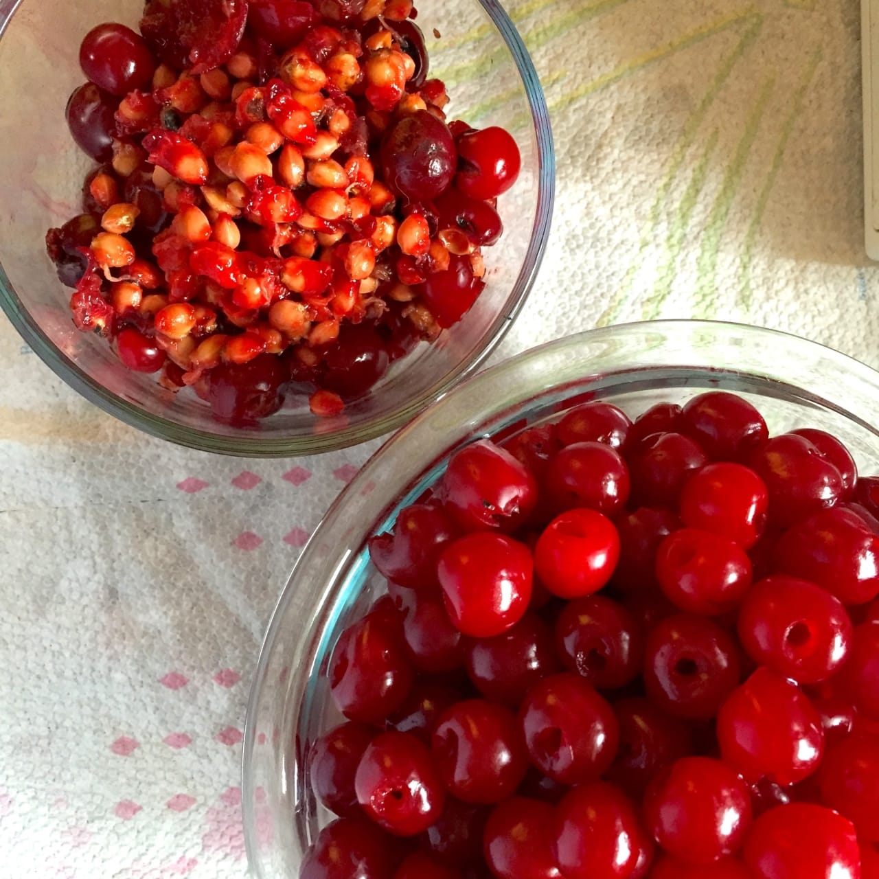 Before you begin, pit your cherries! This part was time consuming, extremely messy (we’re talking cherry juice flying every which way!- wear gloves!!), but pretty easy to do. You just push a disposable straw through the top of the cherry and pop the pit out of the bottom. Easy peasy.