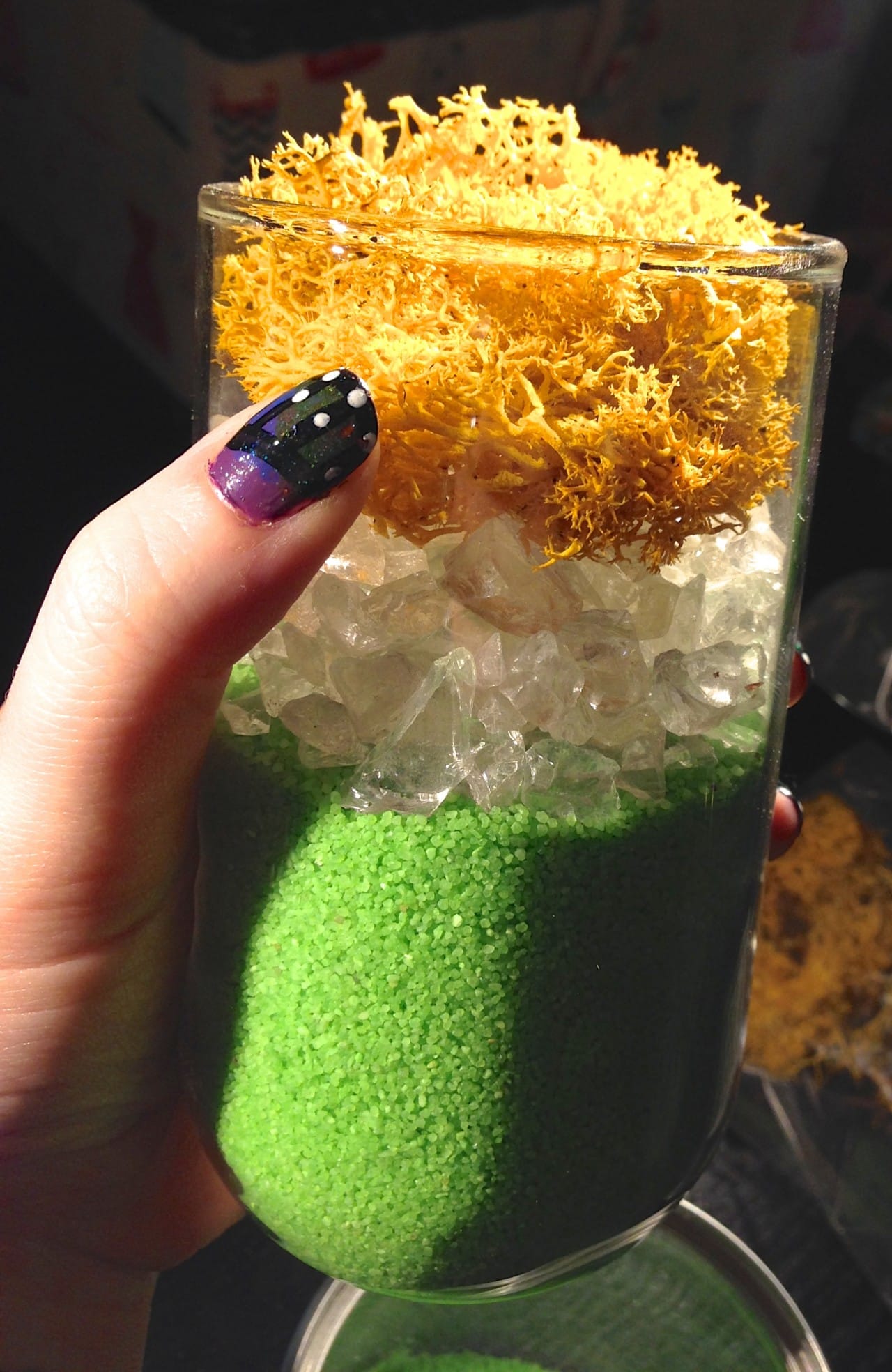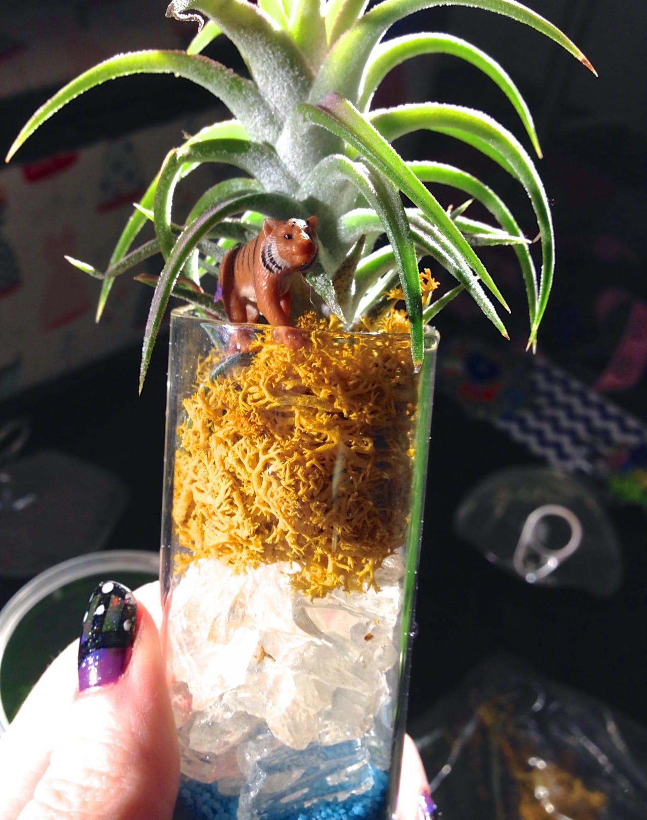 The instructions are too easy for me to even list for you. Just pour the ingredients in one by one, layering them sand-rocks-moss. Place plant on top. Finish with little rubber animal. Enjoy your new plant. Need/want photos of the process? Here ya go!