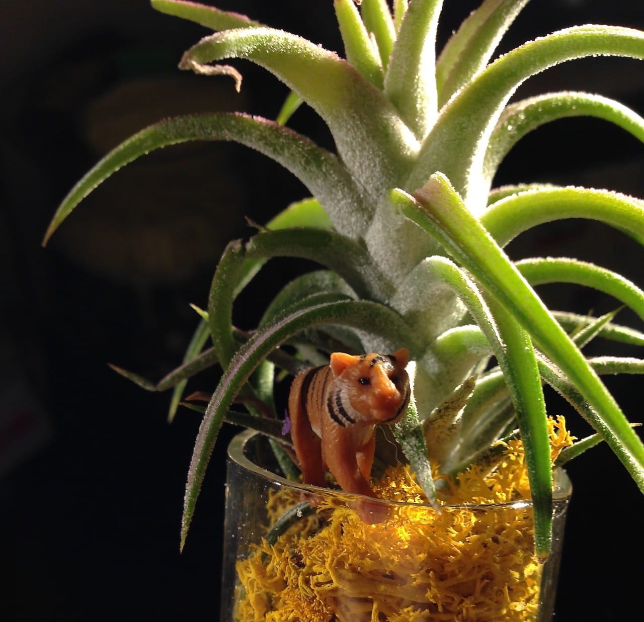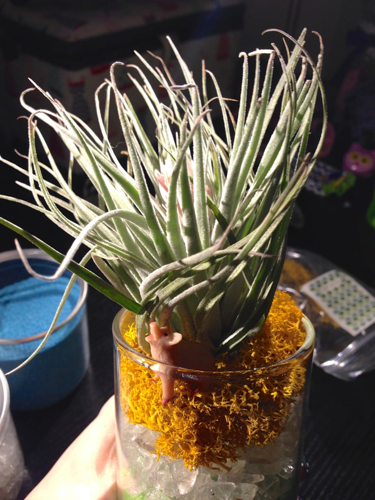 While the plants only need to be submerged in water for about 45 minutes once a week (then dried UPSIDE DOWN for a few hours to prevent the roots from rotting), the moss should be misted more often than that to keep it from totally drying up. Don’t go crazy watering it, though- it’s just moss!