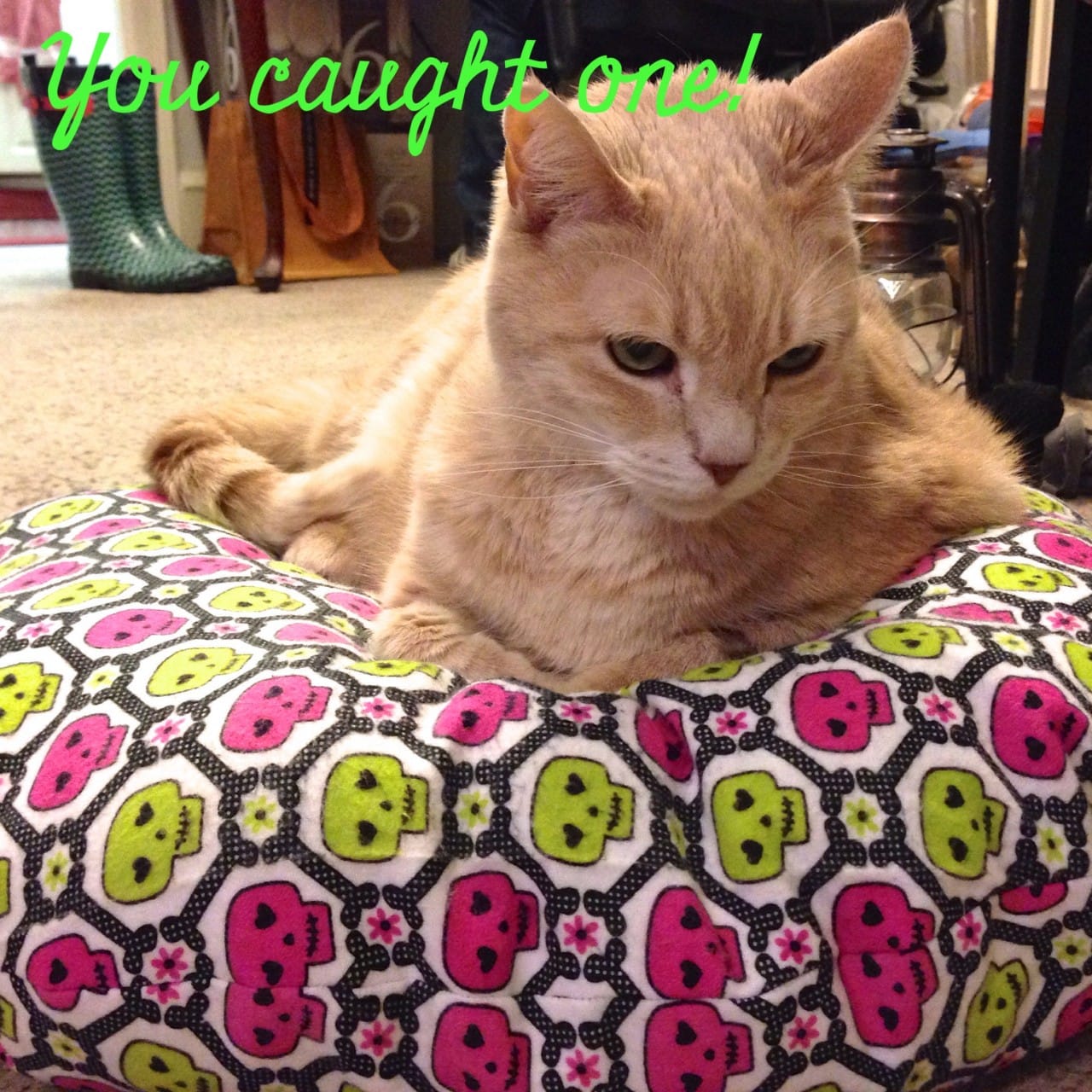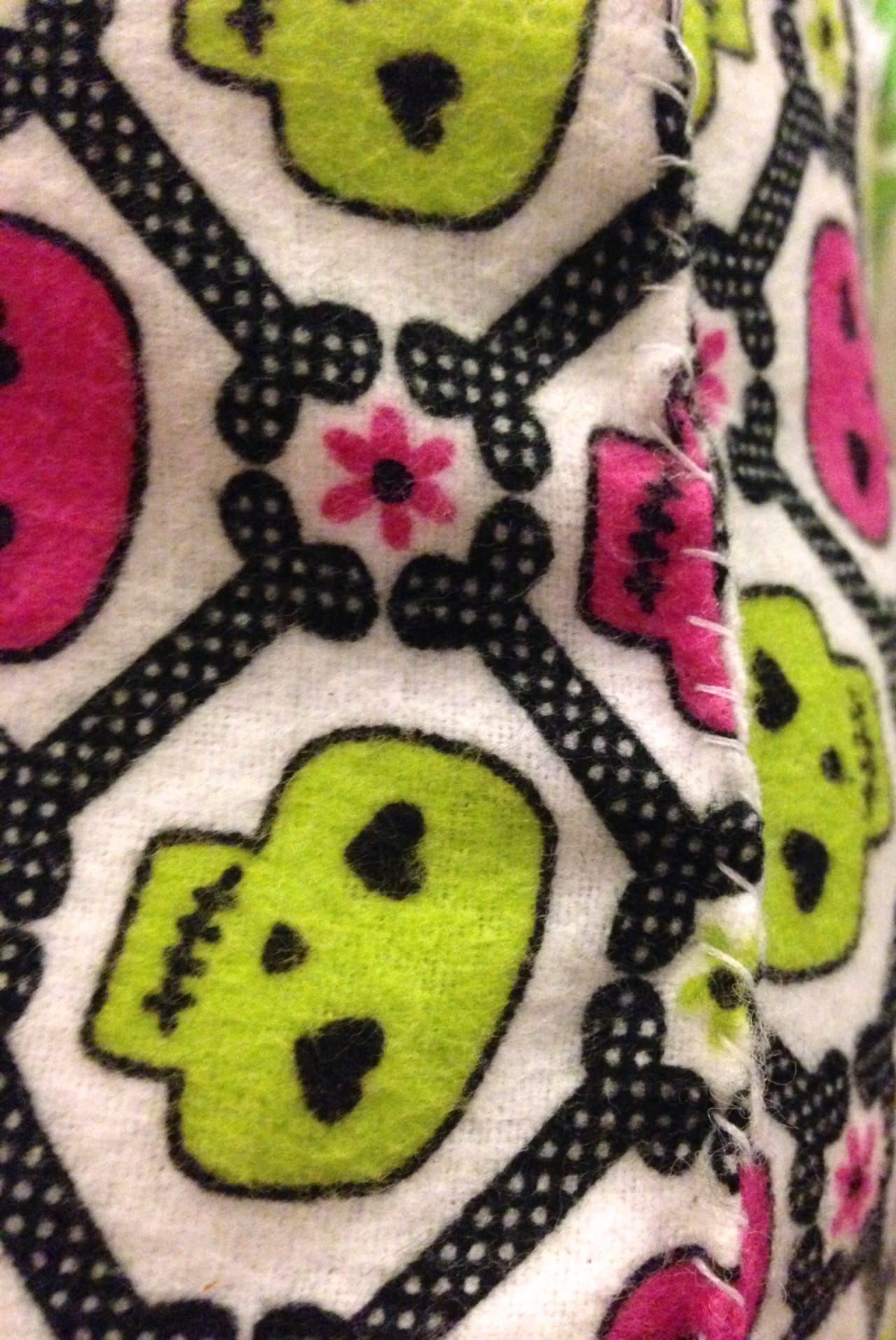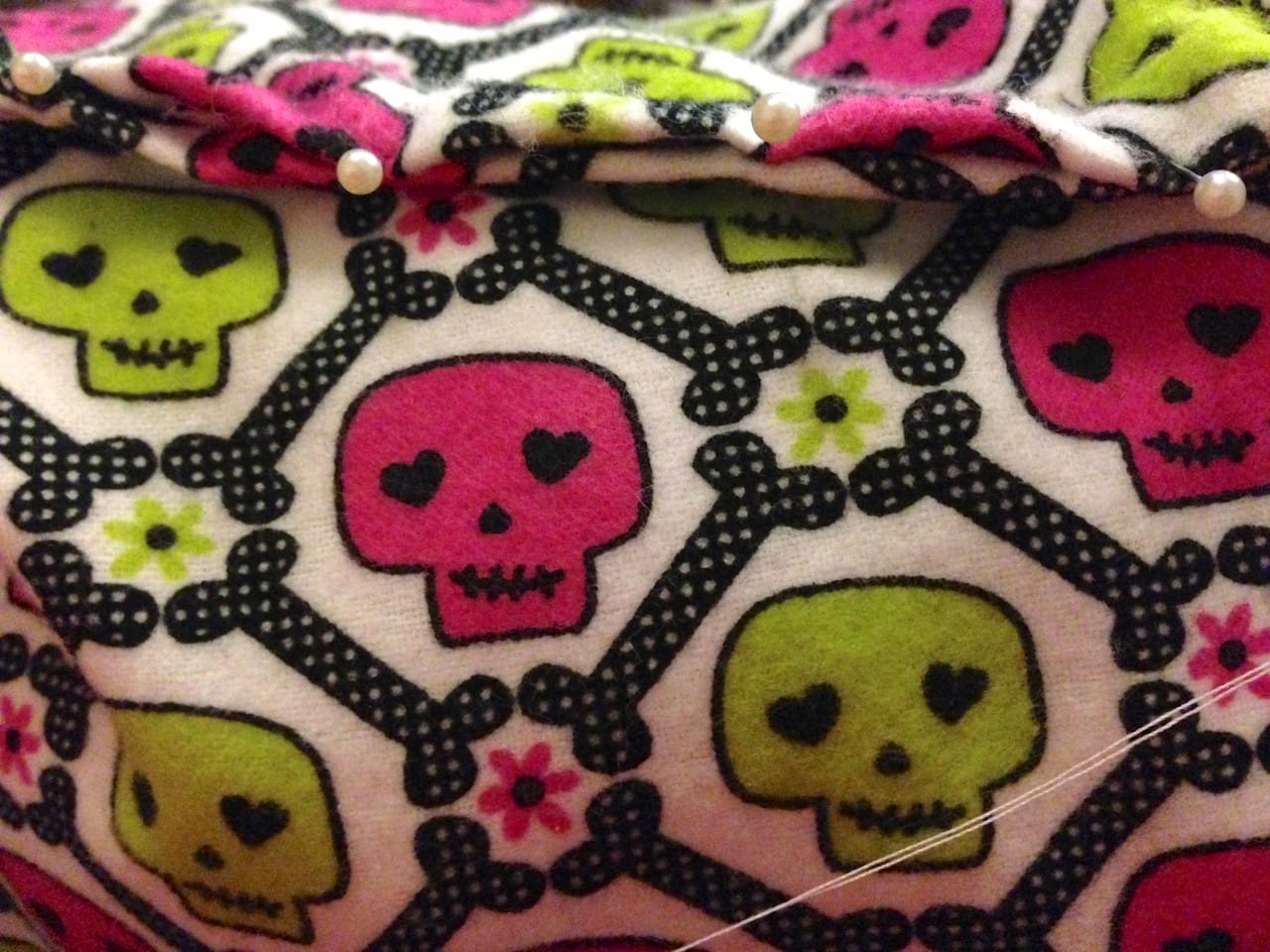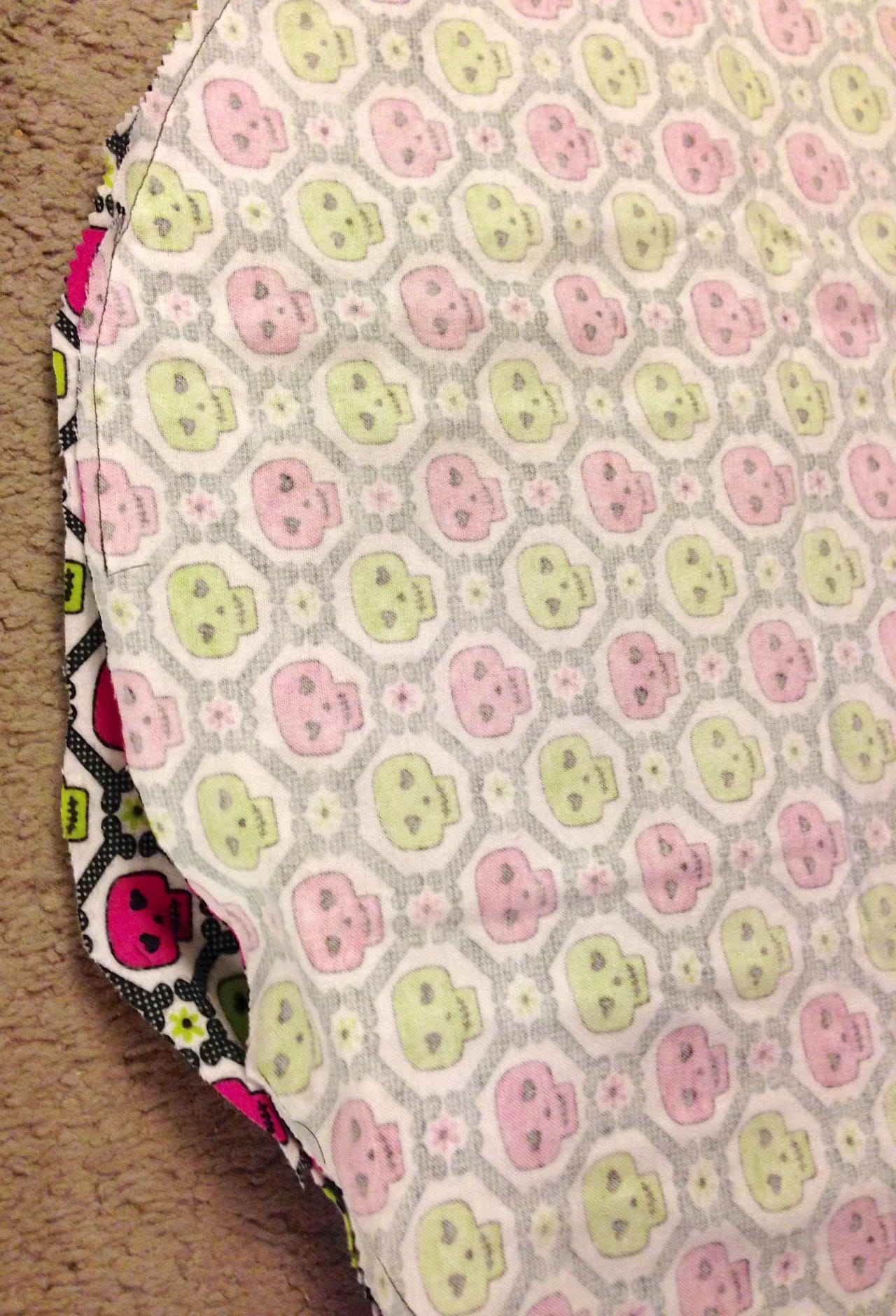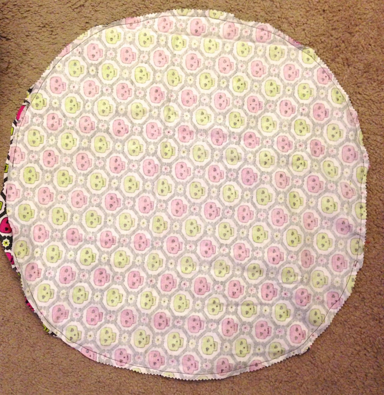 I wanted to choose a fabric that was super soft on their little kitty paws, so I went with a fun flannel design. The little skulls with hearts in their eyes are also super adorable so I won’t mind looking at it all day on the floor in front of me.