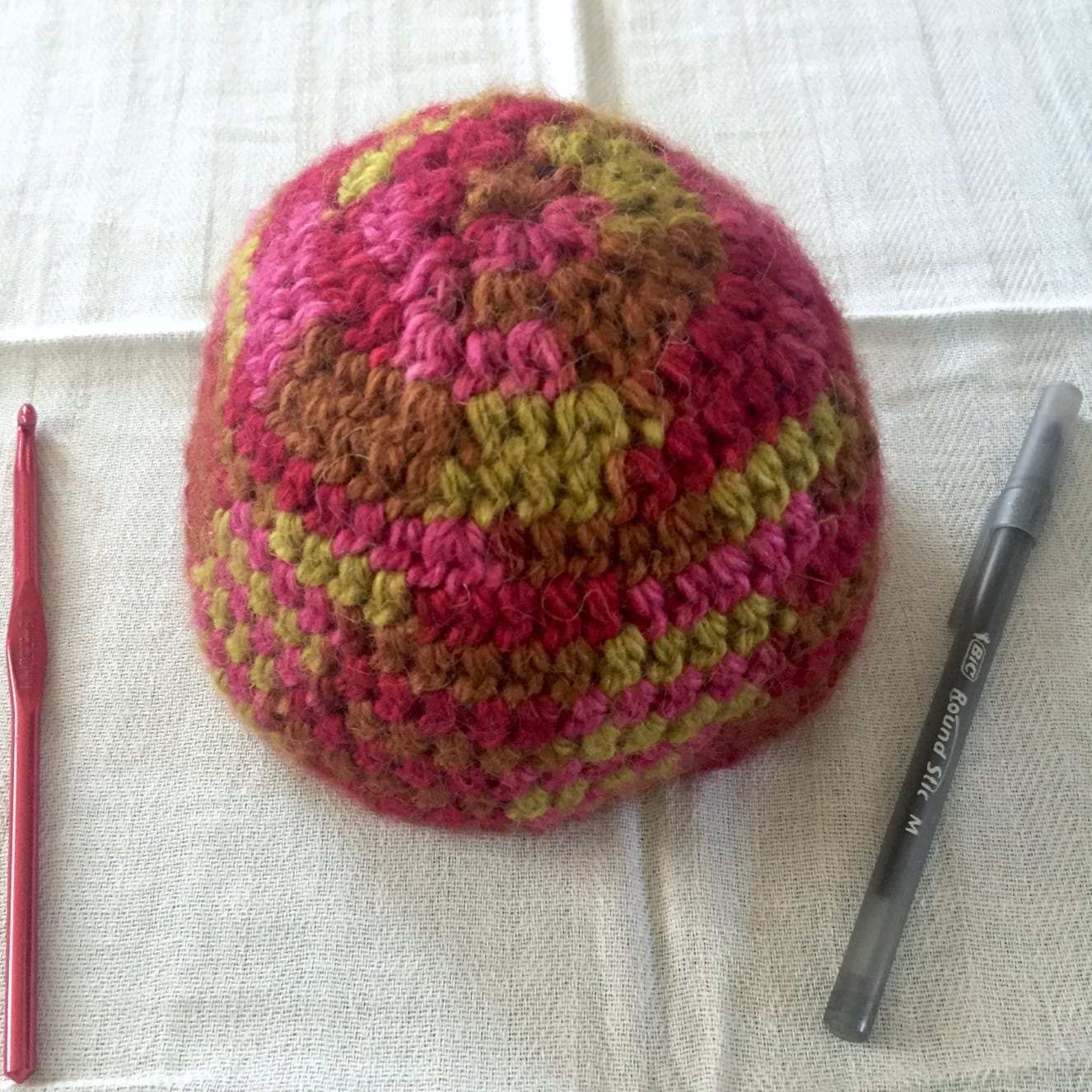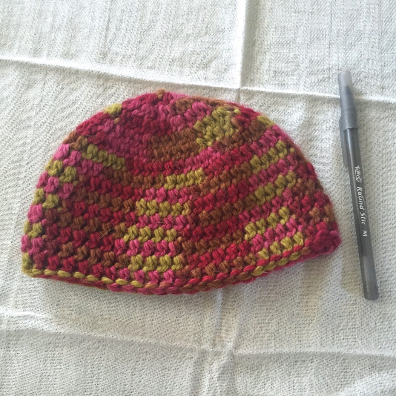 This hat was made following a newborn hat pattern, but because it’s chunky it ended up larger. Still, it’s a tiny hat meant for a tiny head, so if you have a baby on the way, know someone who is due soon or just had a little one, this is a perfect gift for you! Here are a couple of photos of the hat next to a regular ballpoint pen for sizing purposes.
