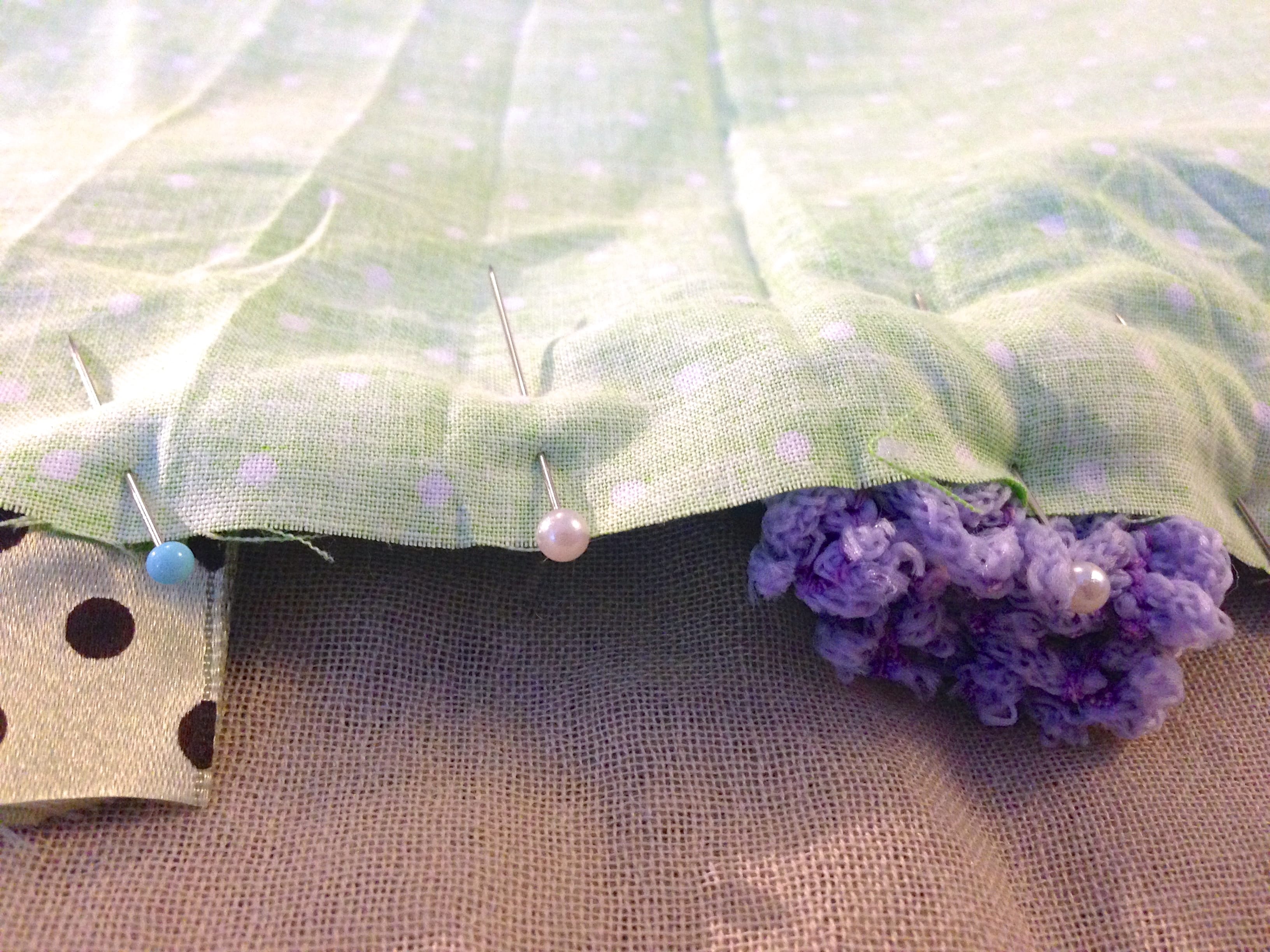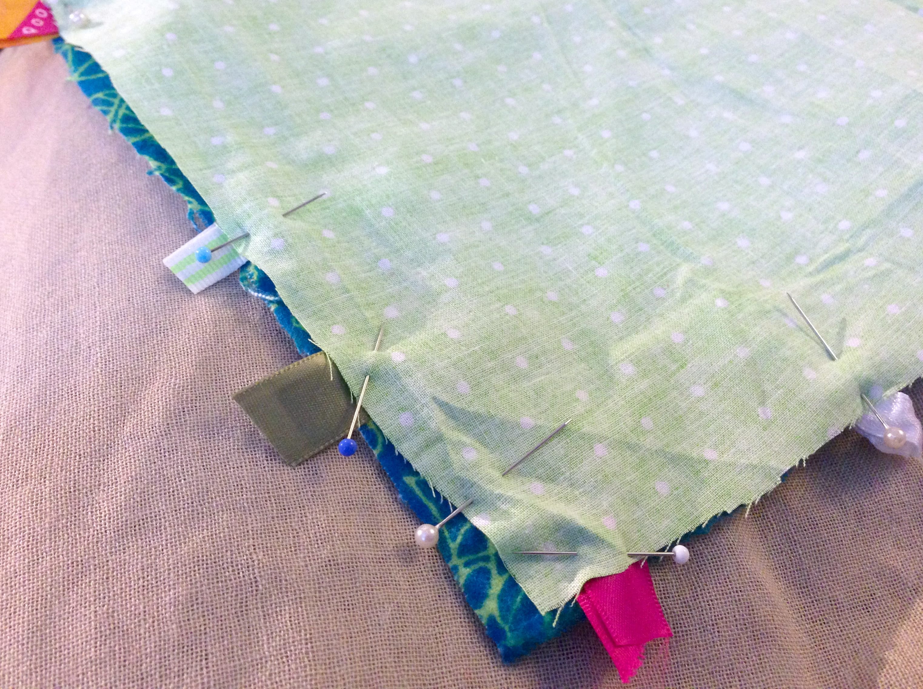 - Begin placing folded pieces of ribbon inside the panels of fabric (making sure the looped part is nice and flat on the inside, and the two ends of each ribbon are sticking out on the outside. Make sure they are all different sizes! Pin them all down. Pin any additional openings as you see fit.