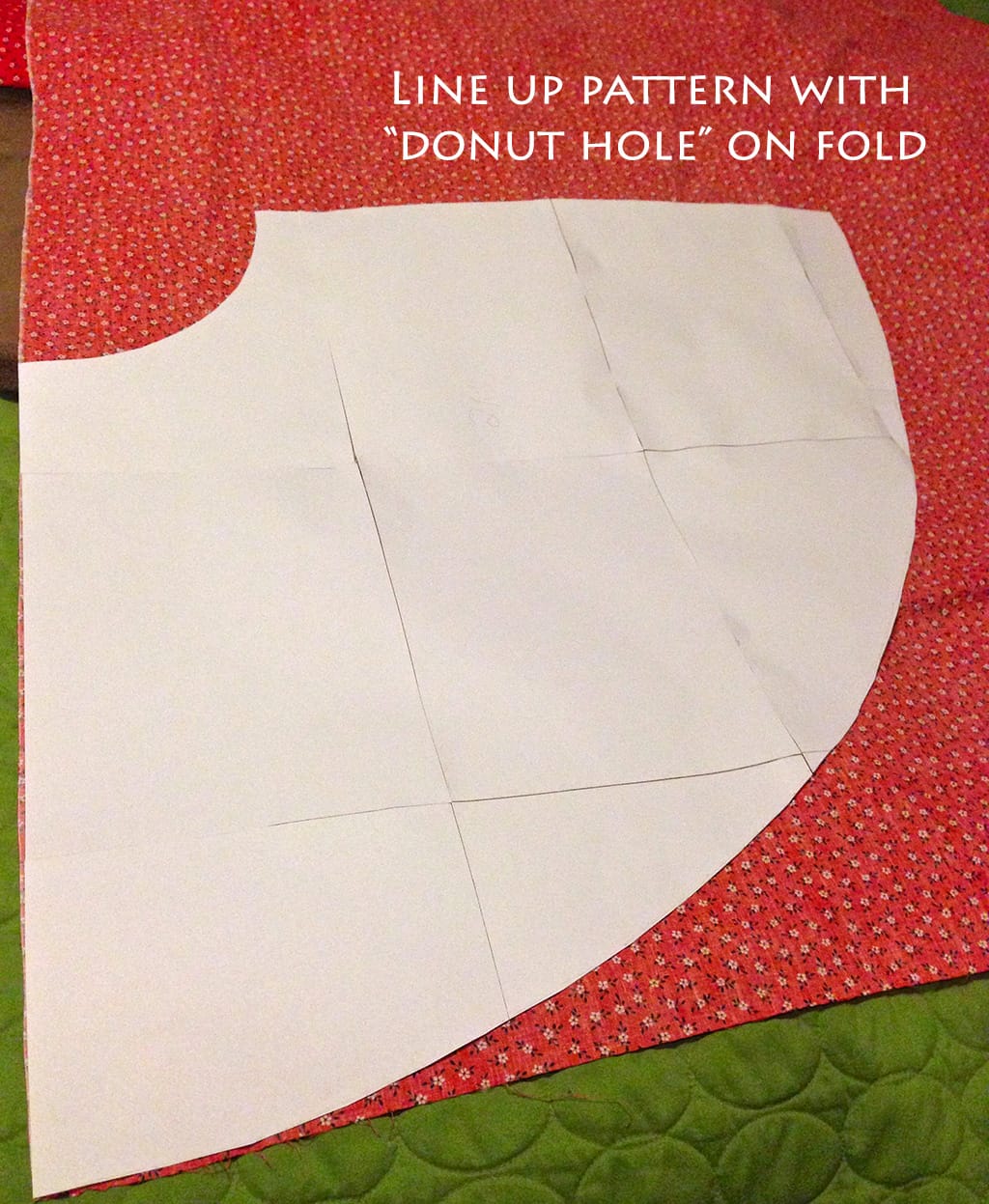 - If your fabric is wide enough to accommodate one whole circle, you will simply fold your fabric in fourths, lining up the folds with the pattern. If your fabric is not wide enough and you need to make two halves of a circle, fold the fabric (as shown below) in half, lining up the folds with the pattern. Make sure fabric is wrong side up, so that you can make marks on it. *Tip: use a pencil or chalk to mark folds to be sure everything is even!