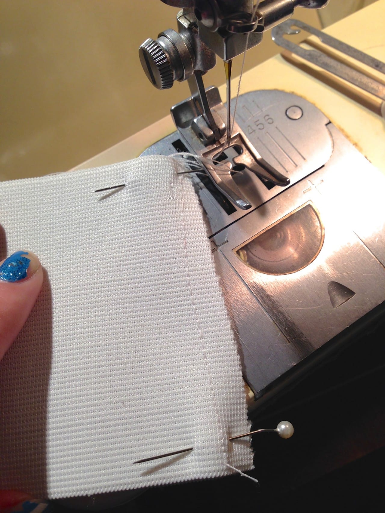 - Time to sew! Going slowly with a straight stitch (or zig zag, if that’s what you prefer!), gently stretch the elastic from pin to pin as you sew it on to the fabric underneath. It’s pretty easy, even if it sounds scary.
