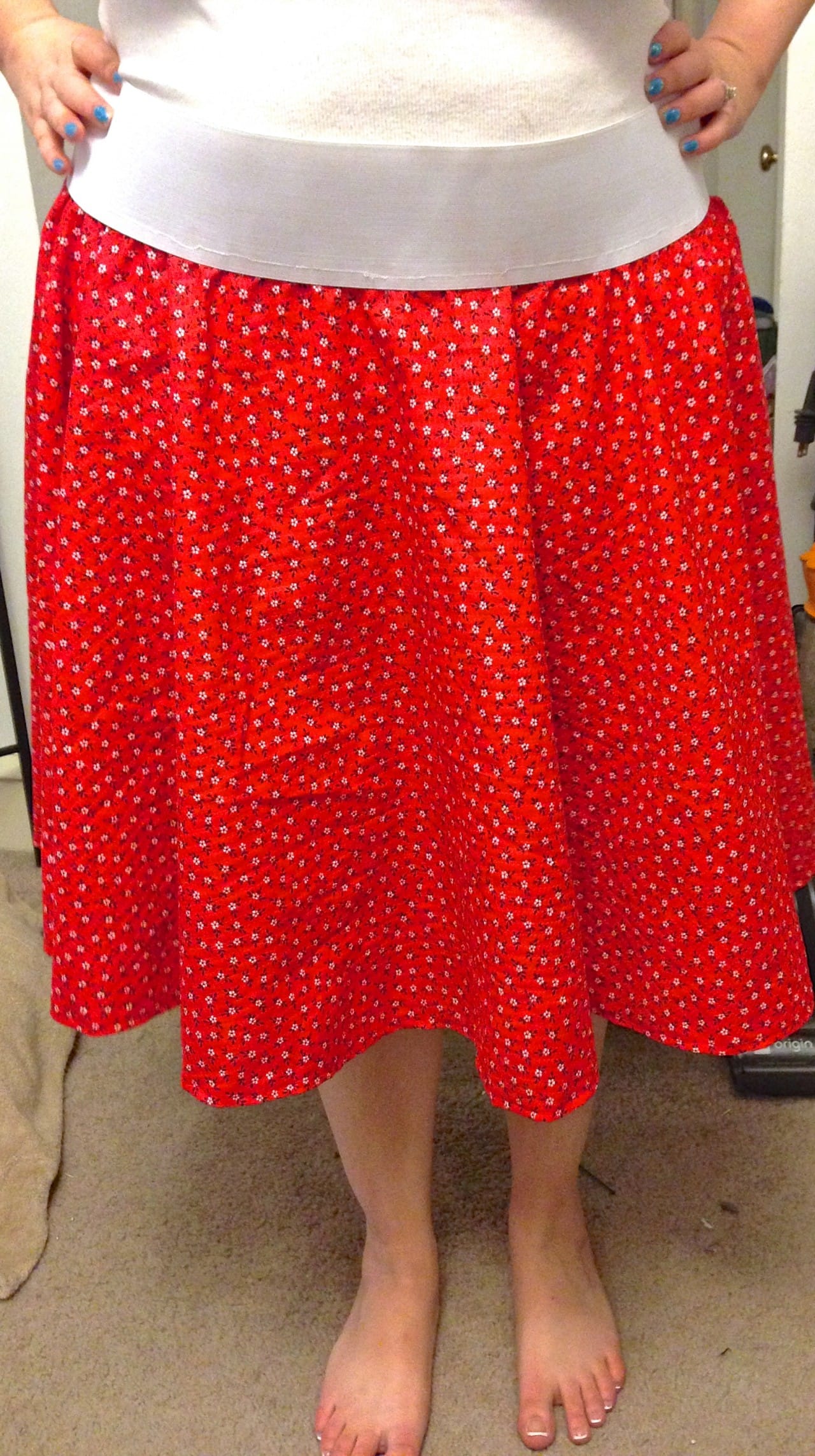 I’ve read many tutorials that recommend you add inches to the elastic before cutting it. I was weary of this (it is ELASTIC after all, it stretches!) so I went with my initial waist measurement minus one inch, which ended up still being a little loose. On my second skirt I subtracted two inches and it was perfect!
