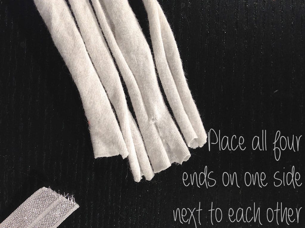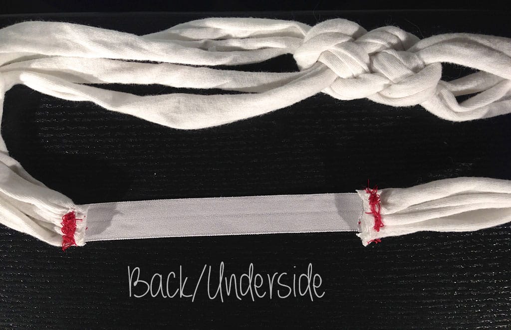 I LOVE this headband! I have made several different colors of it already out of the t-shirt yarn that you already know I have a small obsession with (thumbs up for upcycling!) For awhile, I was just tying the ends to a hair tie, like I did in the no-sew version of my braided headband, but I recently bought some fold-over elastic and decided to add it in to the mix. I’m liking the way it came out!