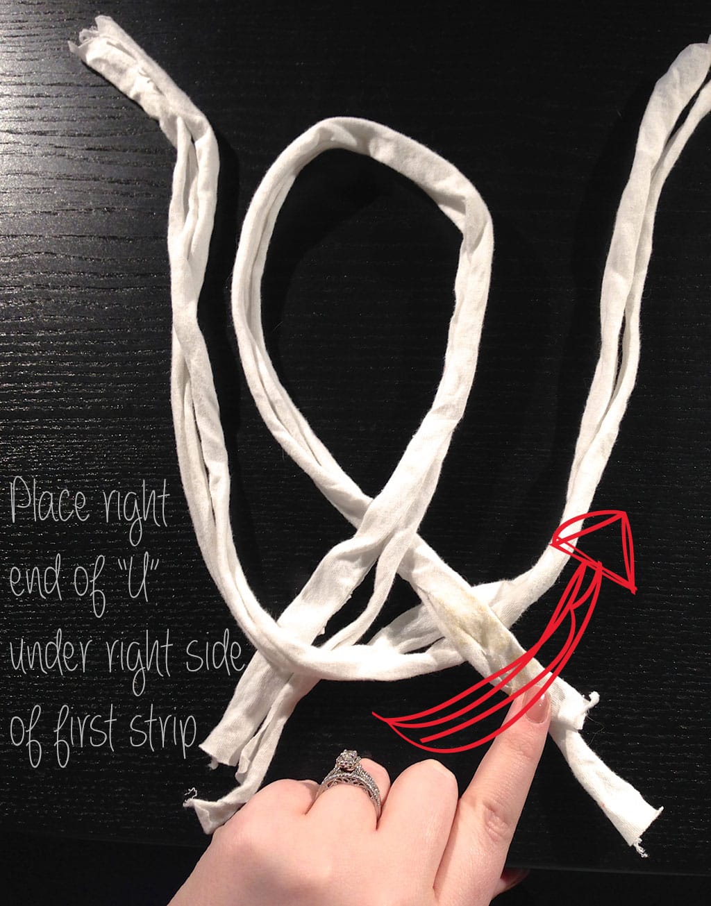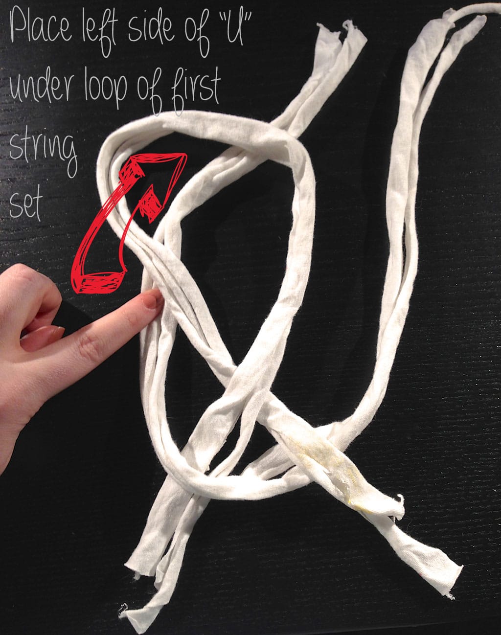 - Next, take your second set of strings and make a “U” shape on top of the first set of strings.