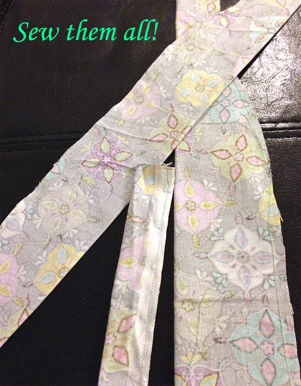 For just the large main strips, you’ll need a taper. This will be super helpful later when you are trying to fit all the fabric on the end of each into the teeny little elastic covering tube!