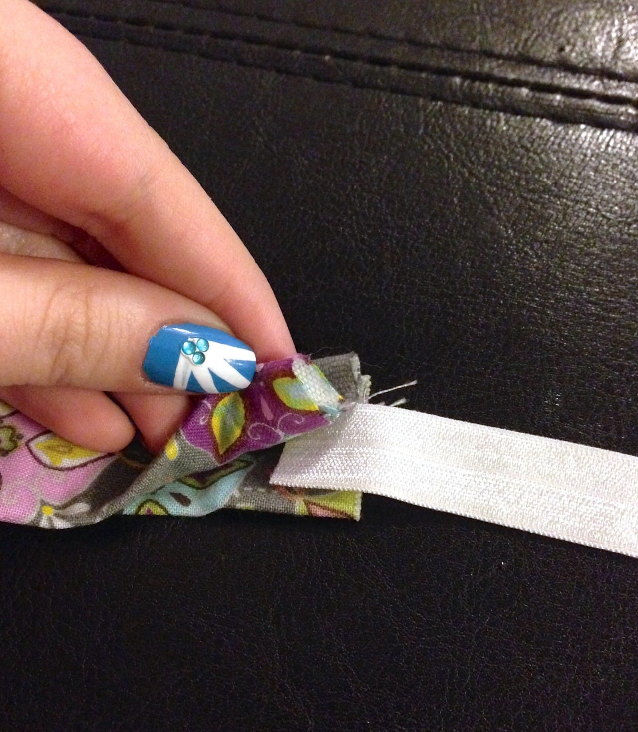 - Grab your elastic strip, and stitch it (via machine or by hand) right to one of the headband ends- this means through both strip ends of that one side. You can sandwich it between them, or sew it right on top. It doesn’t matter, since it will get covered later anyway. Hopefully the photos give you a little explanation! I overlapped and pinned about a half inch of elastic on to the fabric, then sewed. Make Sure To Back Stitch Again! And then forward stitch, and back stitch once more! Remember, this specific part is going to get pulled the most!
