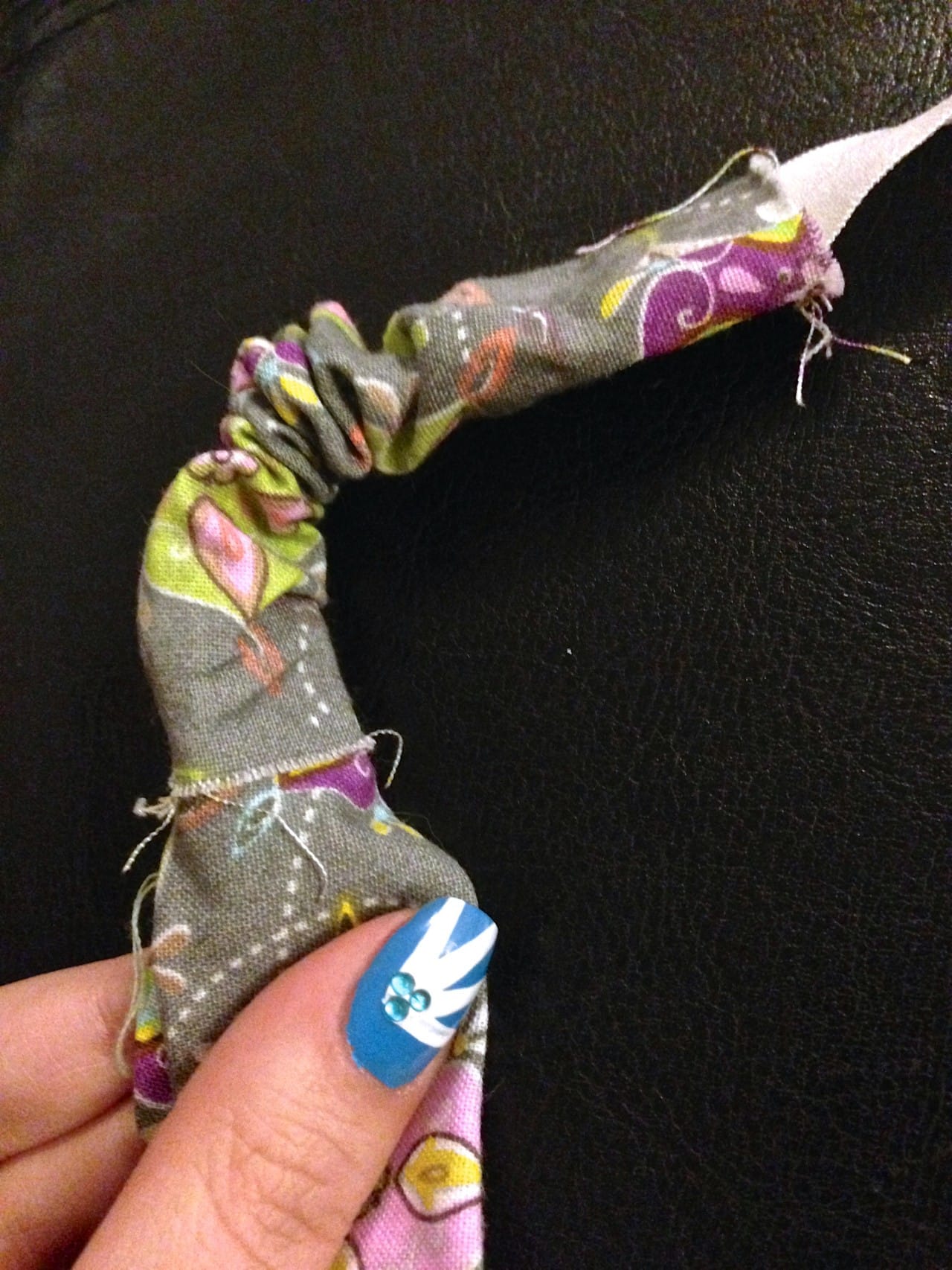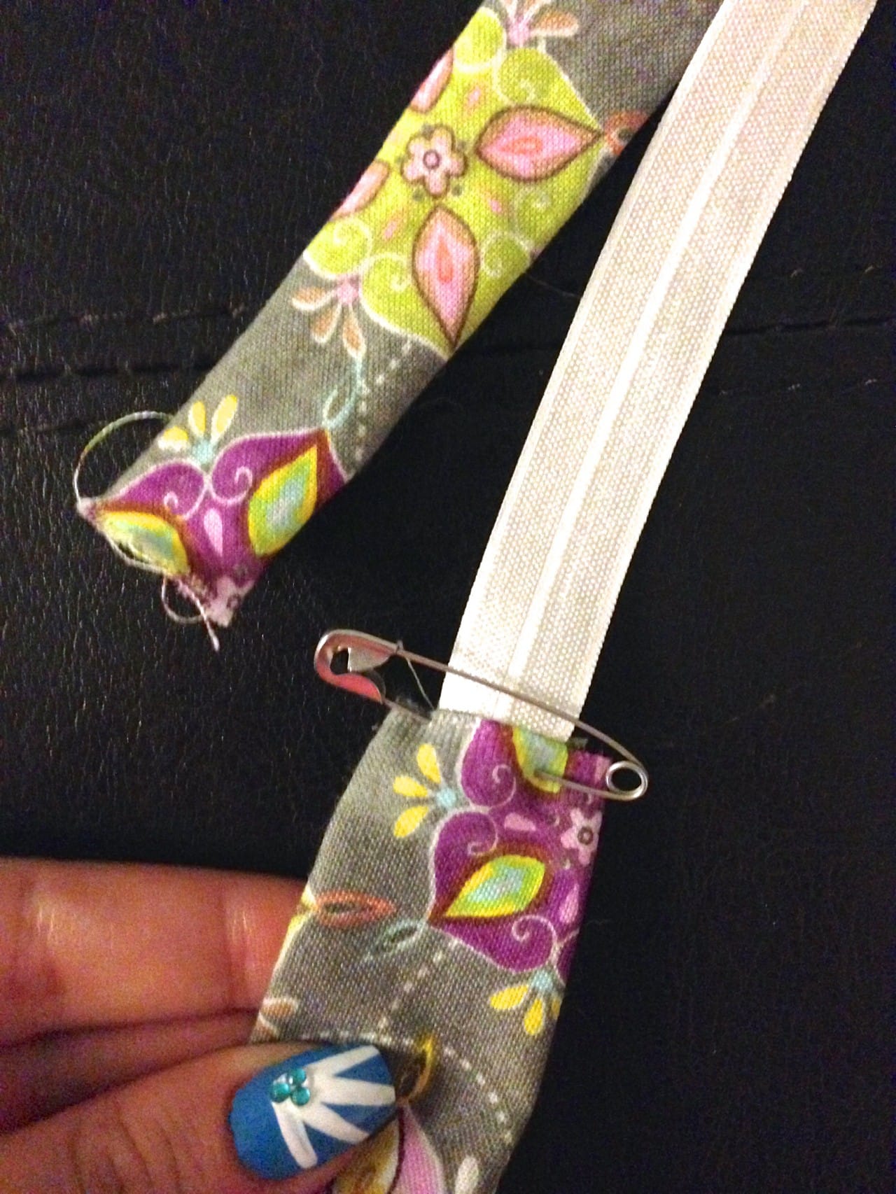 - Fold the raw edges of the elastic covering tube under itself to make it look nice and clean. Pin and sew!