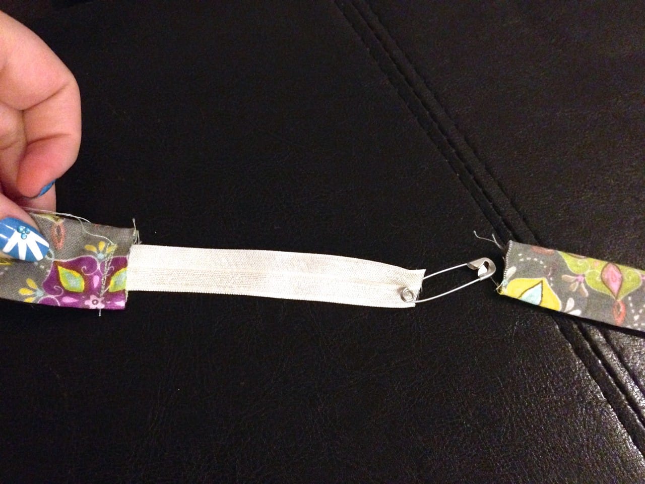 - Take out the safety pin, and repeat the last three steps to the other side. [Sew elastic. Shimmy elastic covering over all exposed elastic. Fold it in. Pin and sew.]
