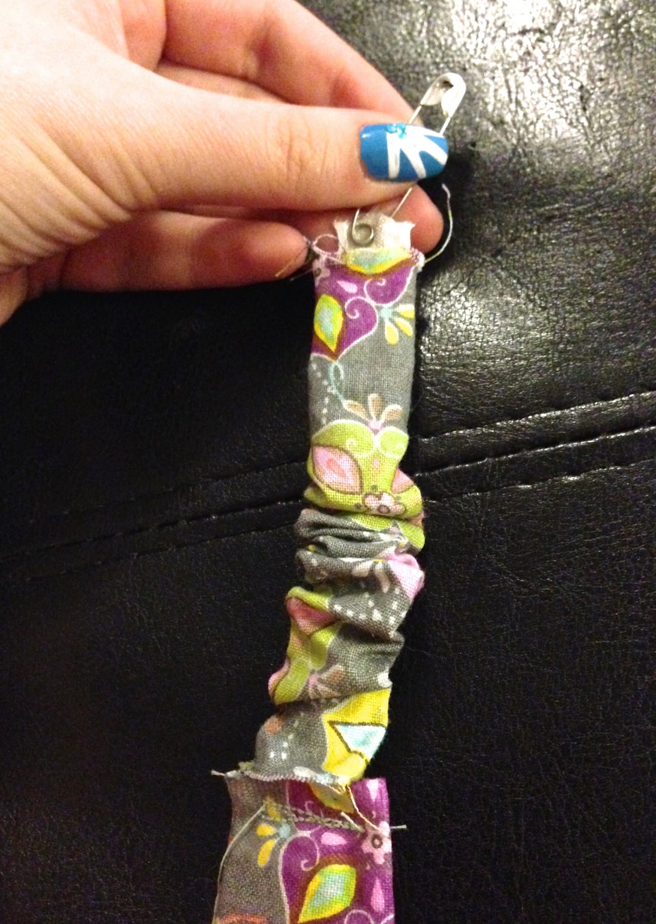 - Attach your safety pin to the free end of the elastic. Slide the elastic covering tube over the elastic and scrunch it down til the safety pin is free again. Use the safety pin to hold the end in place while you carefully shimmy the tube down down down until it covers all the exposed elastic that has been sewn down. Pinch and squish until it’s all covered.