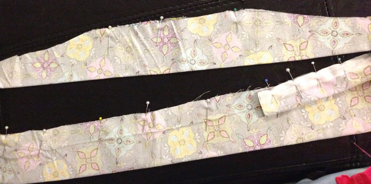 - Fold each of your strips (the 2 large main ones and the one small elastic covering one) in half, lengthwise, with right sides touching. Pin all the way across, forming a tube for each.
