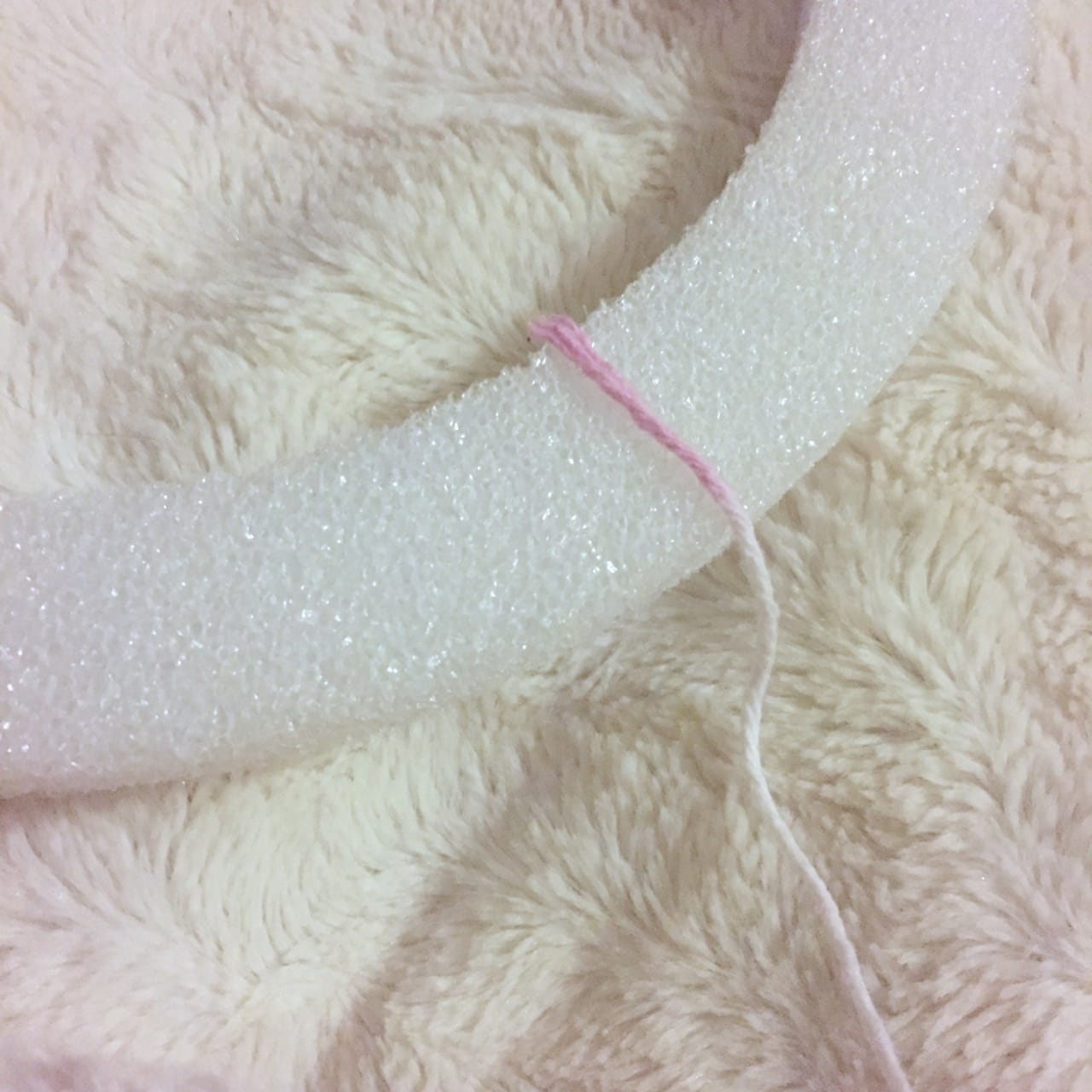 - With your glue gun plugged in and ready to go, tack on the first bit of yarn.