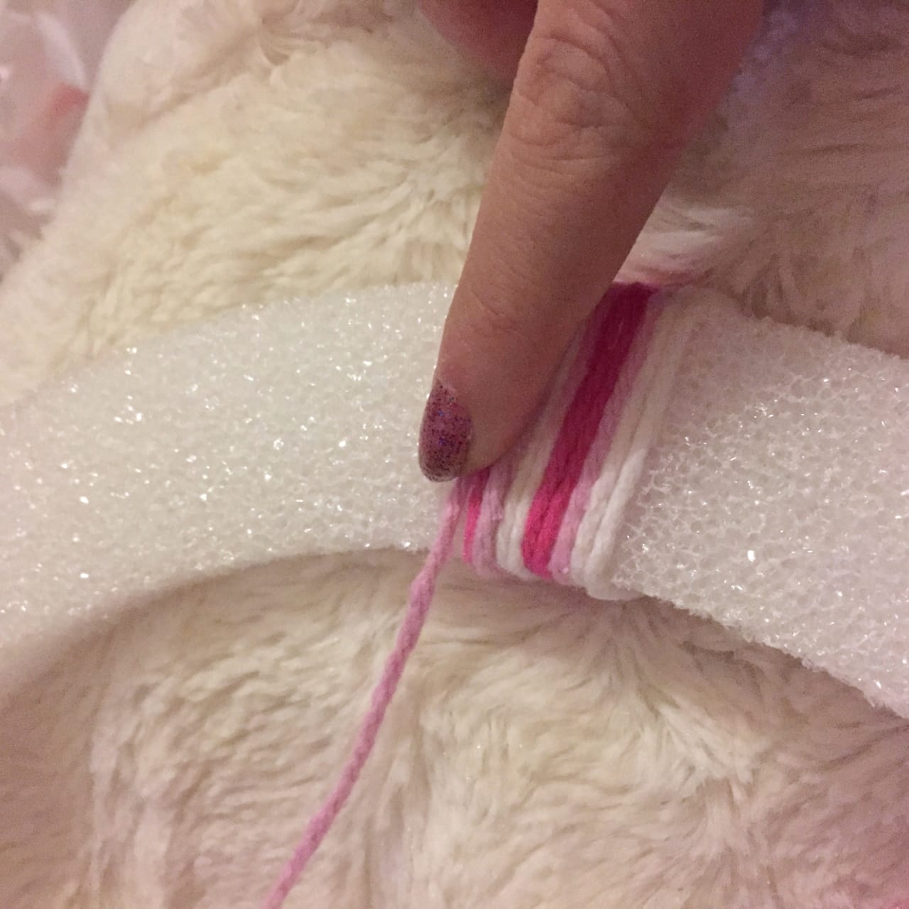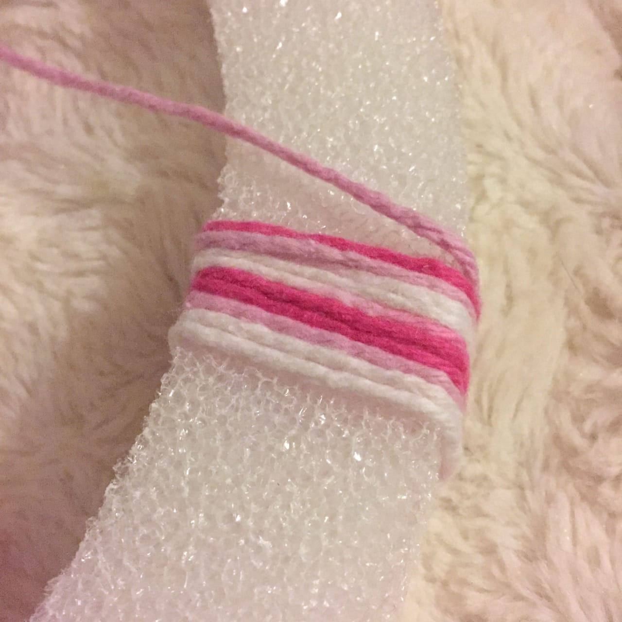 - Yarn (I used one small skein of pink/white yarn)