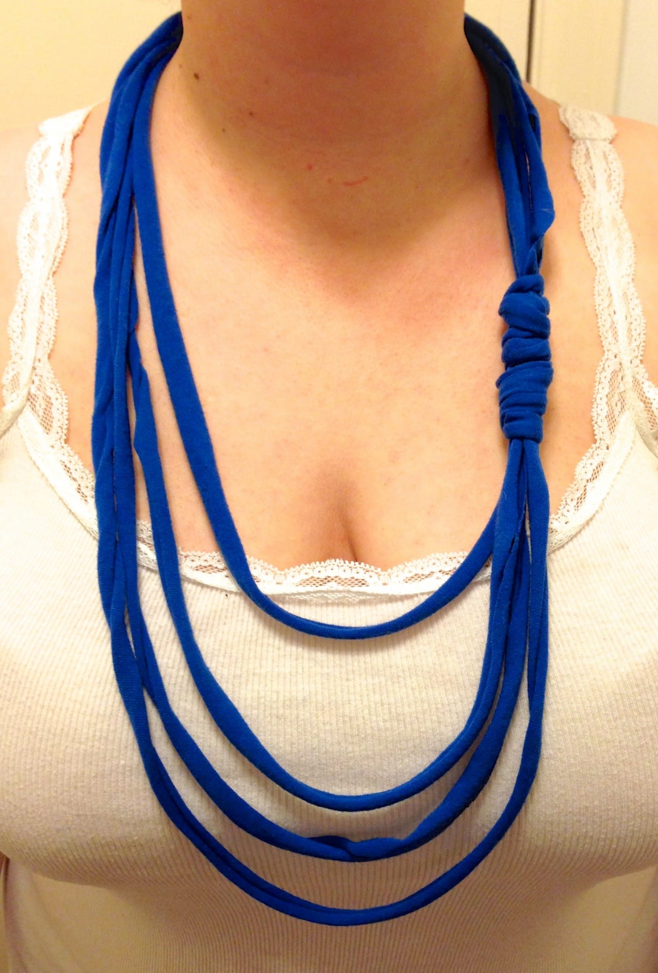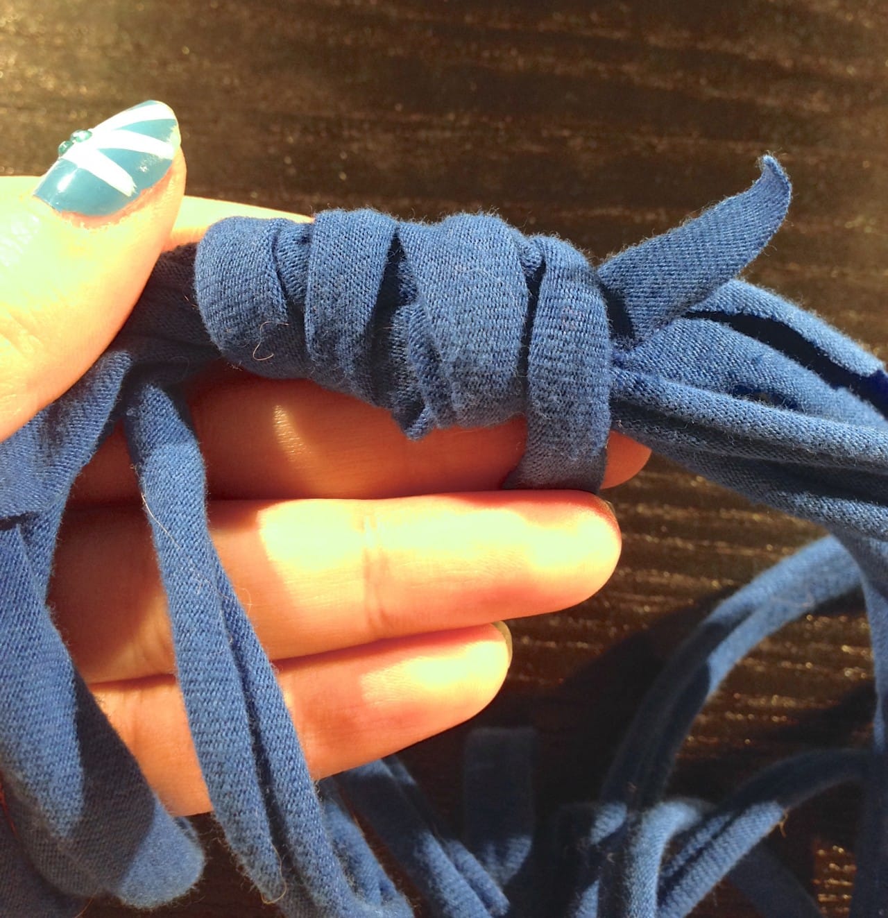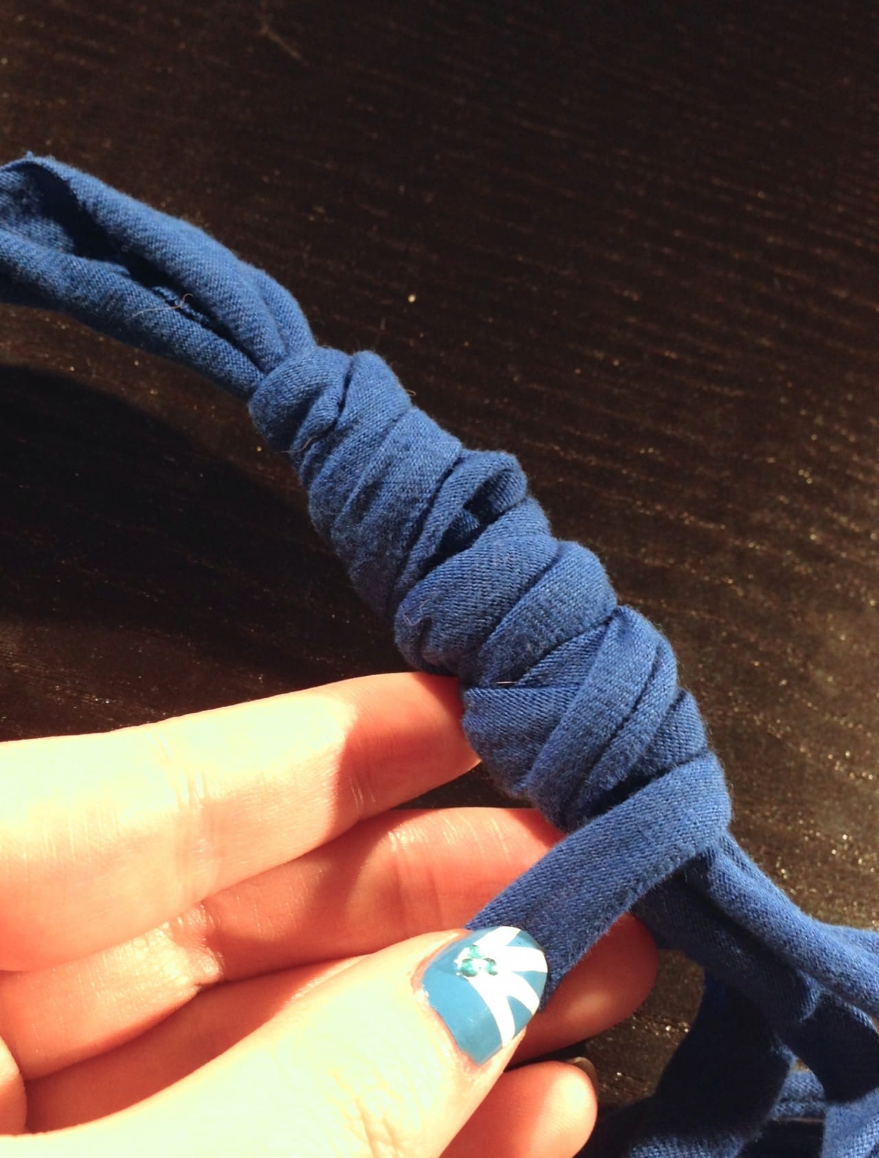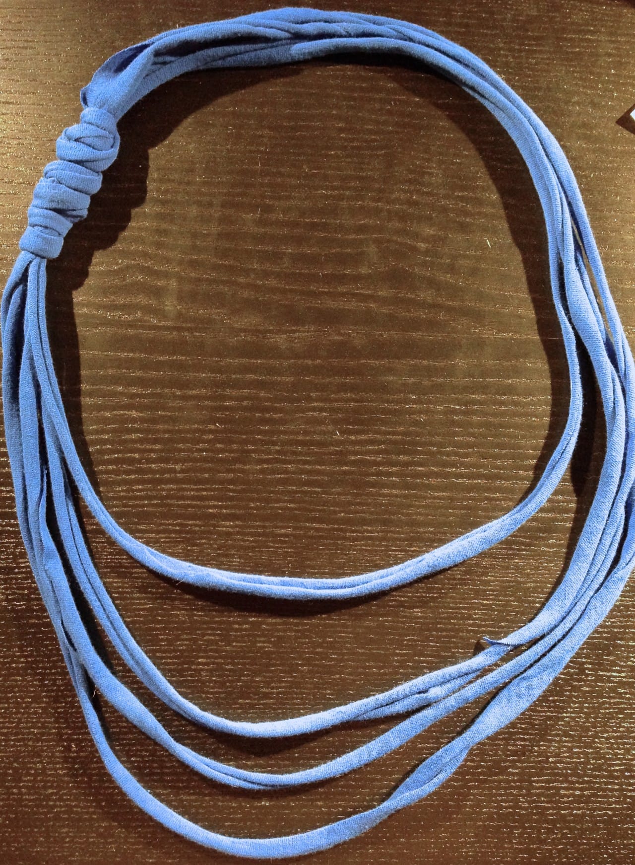 I already made a rust orange one, and this blue one. I also used the same concept, only making all loops the same length instead of differing so that I could make matching bracelets. I’m searching our drawers for more t-shirts I can sacrifice in the name of crafting, as well! Hope you like making these as much as I do!