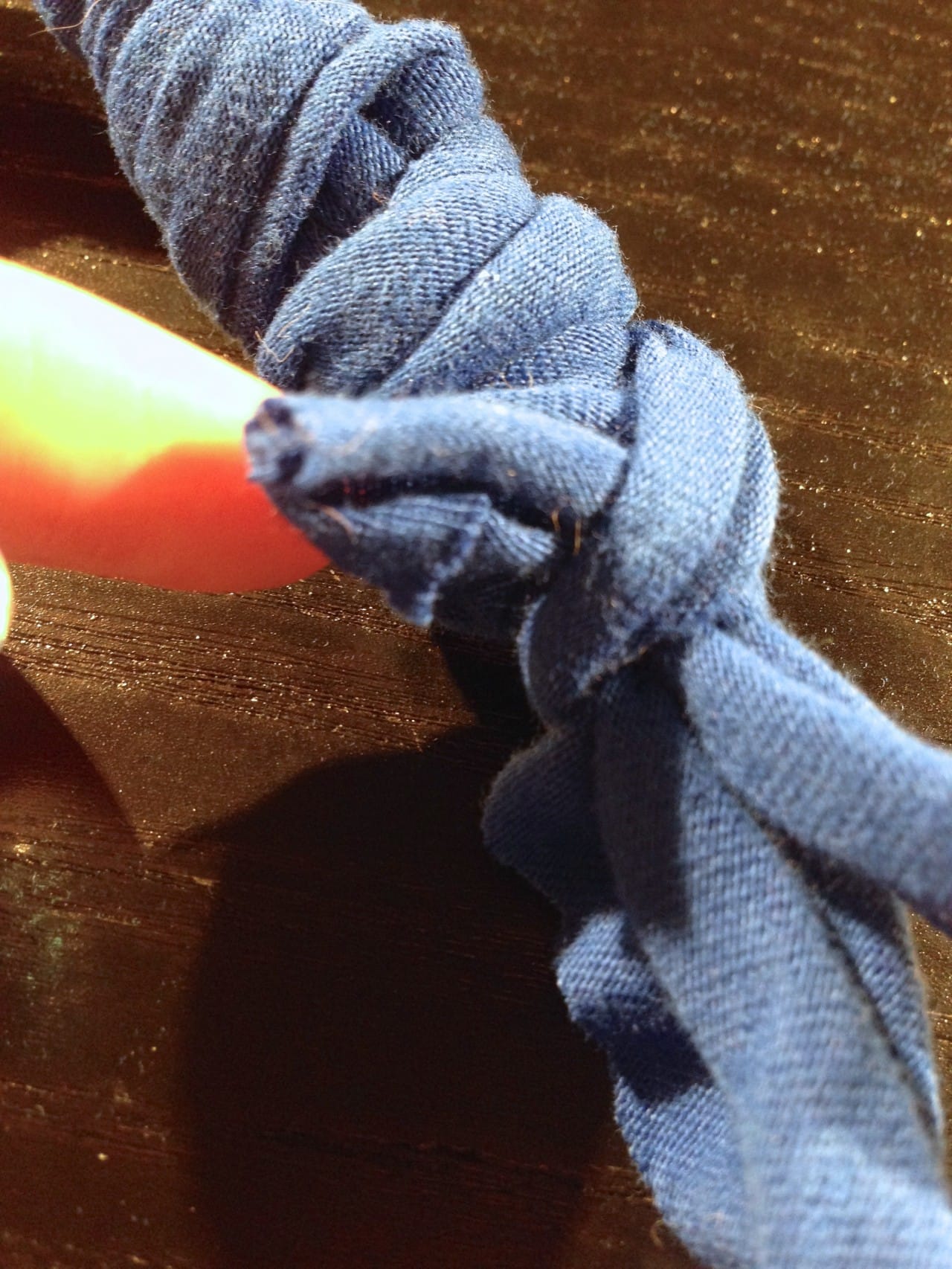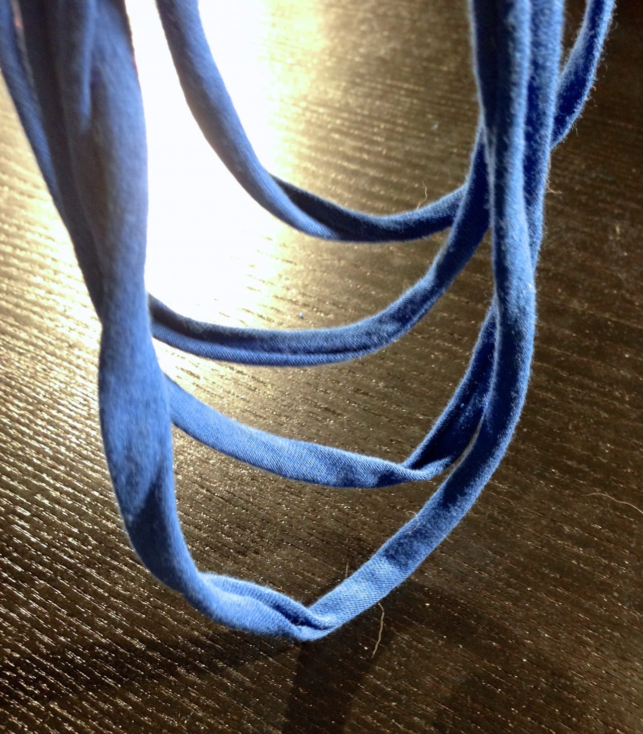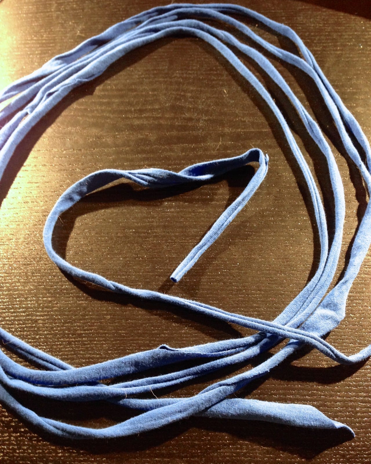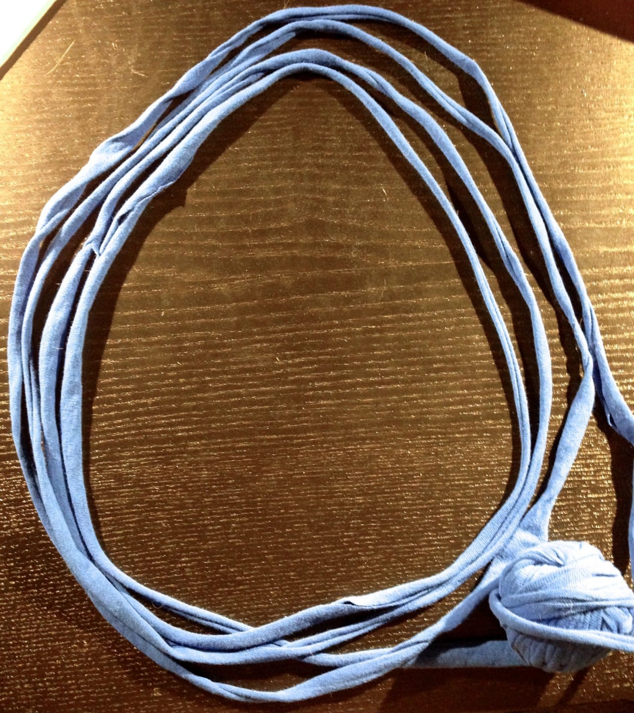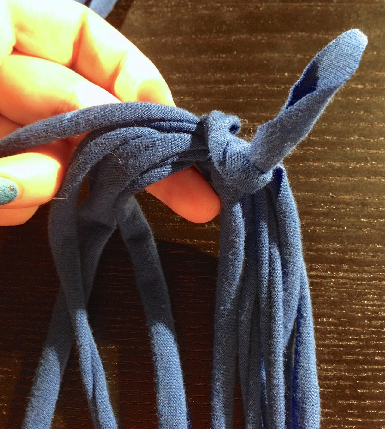 I already made a rust orange one, and this blue one. I also used the same concept, only making all loops the same length instead of differing so that I could make matching bracelets. I’m searching our drawers for more t-shirts I can sacrifice in the name of crafting, as well! Hope you like making these as much as I do!