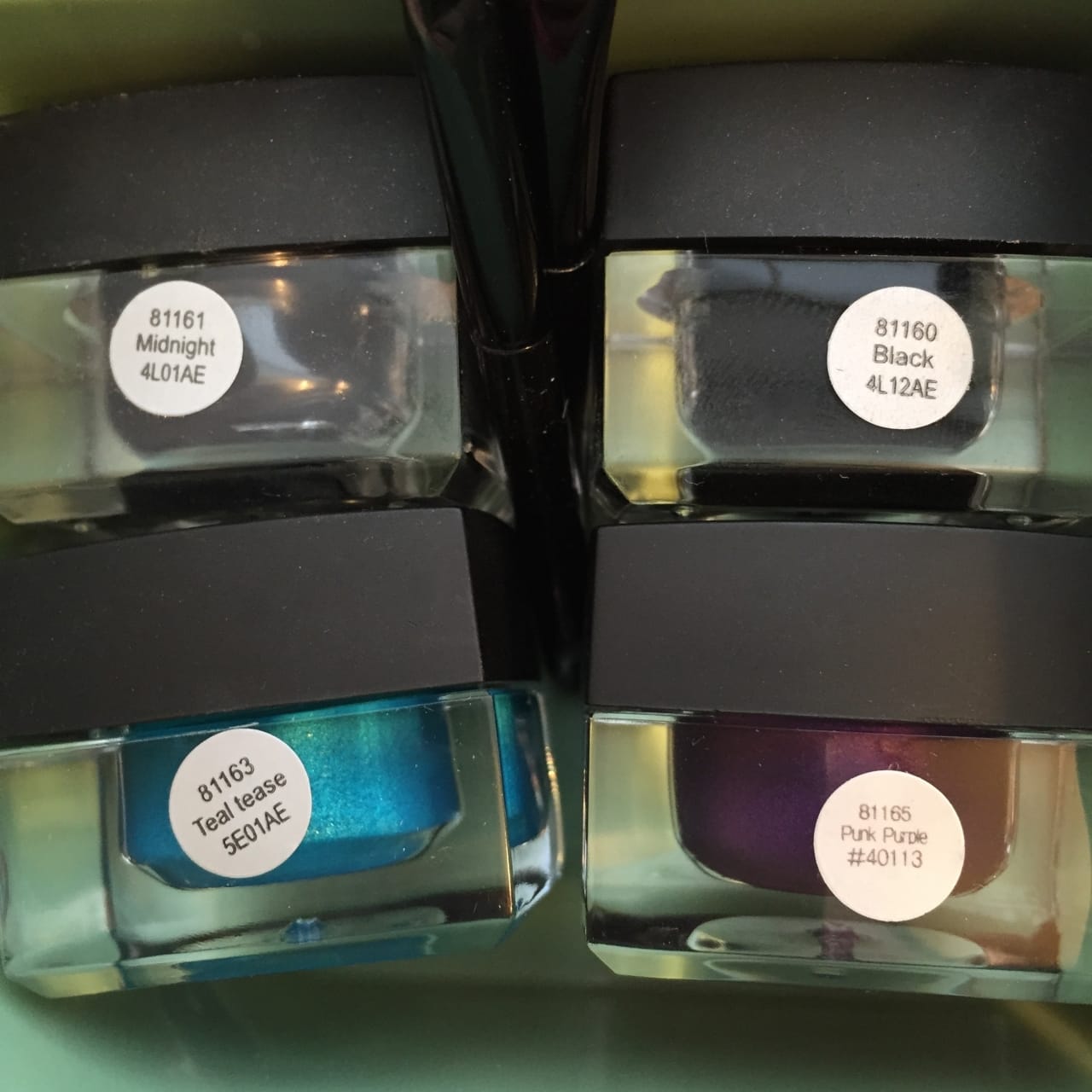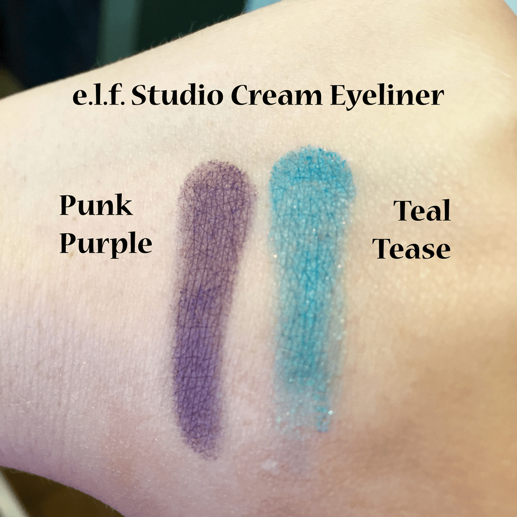 Next up are some new e.l.f. Studio Cream Eyeliners that I picked up. I already have them in Black and Midnight Blue, and I didn’t swatch those because they are exactly the colors you would expect them to be. I DID swatch out the new colors I bought! I got Teal Tease to do some fun looks with, though I probably won’t wear it out all too often. It’s very pretty and sparkly, though! The Punk Purple is a color I may use more often, though it is a little harder to work with for some reason. It’s also less sparkly than the teal.
