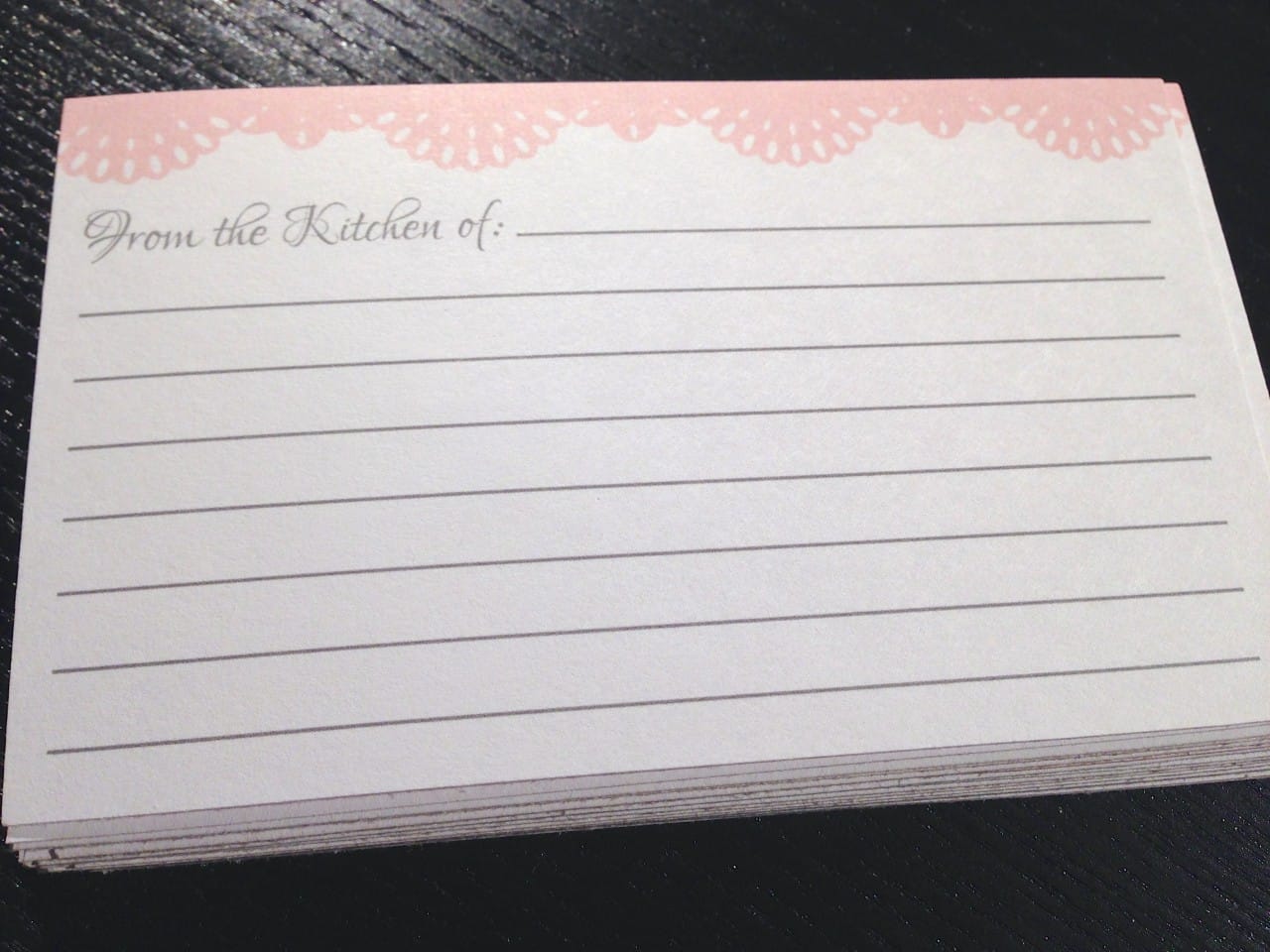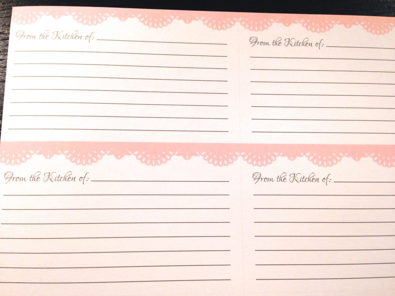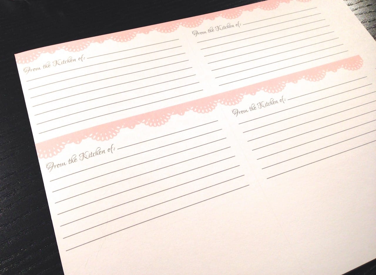 There were a lot of cute recipe cards and binders for them that I found while searching, but none that went with the theme of the shower. I really wanted everything to match, so I decided to just make it all myself. We bought a wooden recipe box, I made dividers with my doily hole puncher and cardstock, and had Husband help me create little doily designs in Illustrator for some DIY recipe cards in the pale pink color I needed. Then we printed them out four to a sheet, and I used my paper cutter to finish them off. That part took quite a while, but they came out great! So great, that I decided I’d make another batch for a giveaway to my readers.