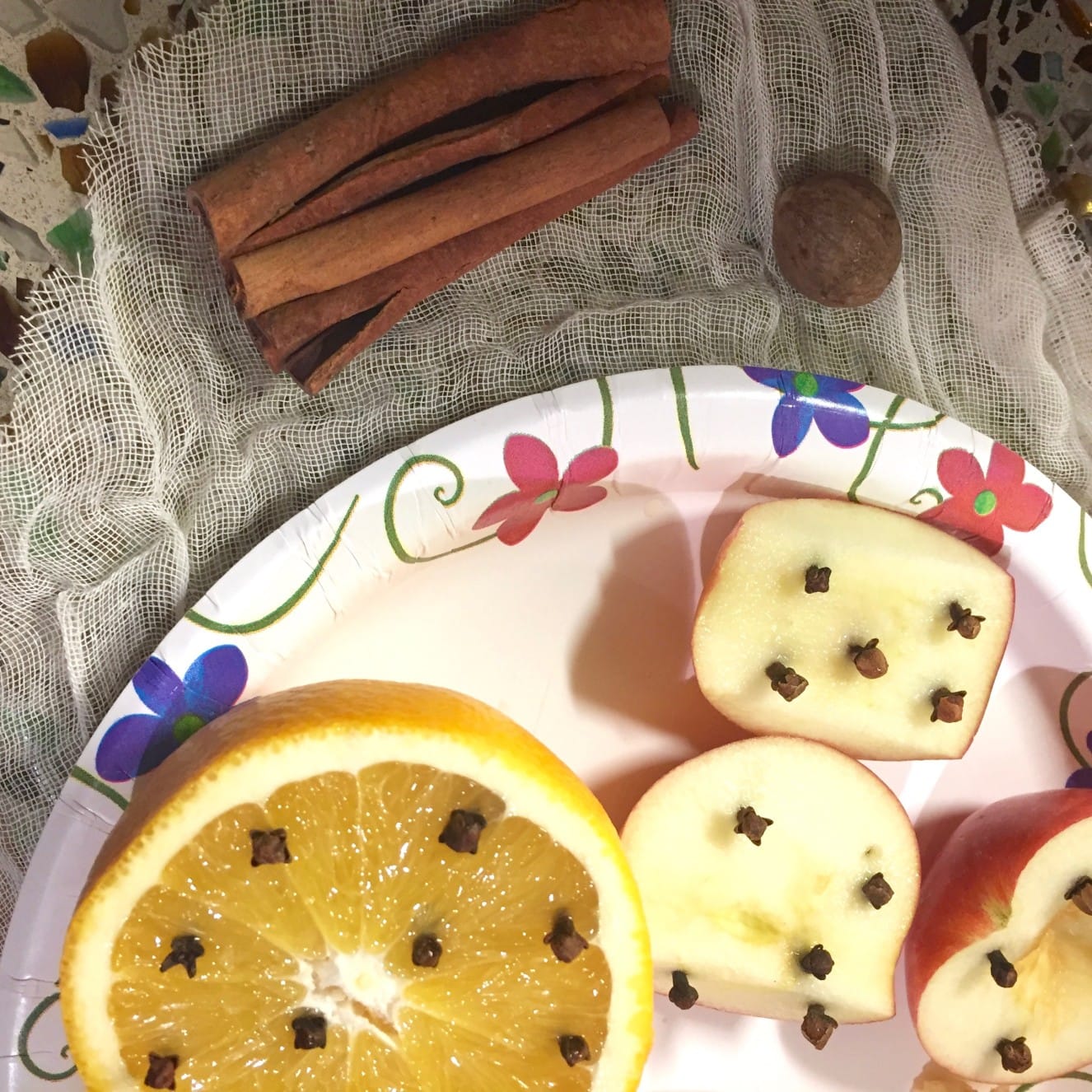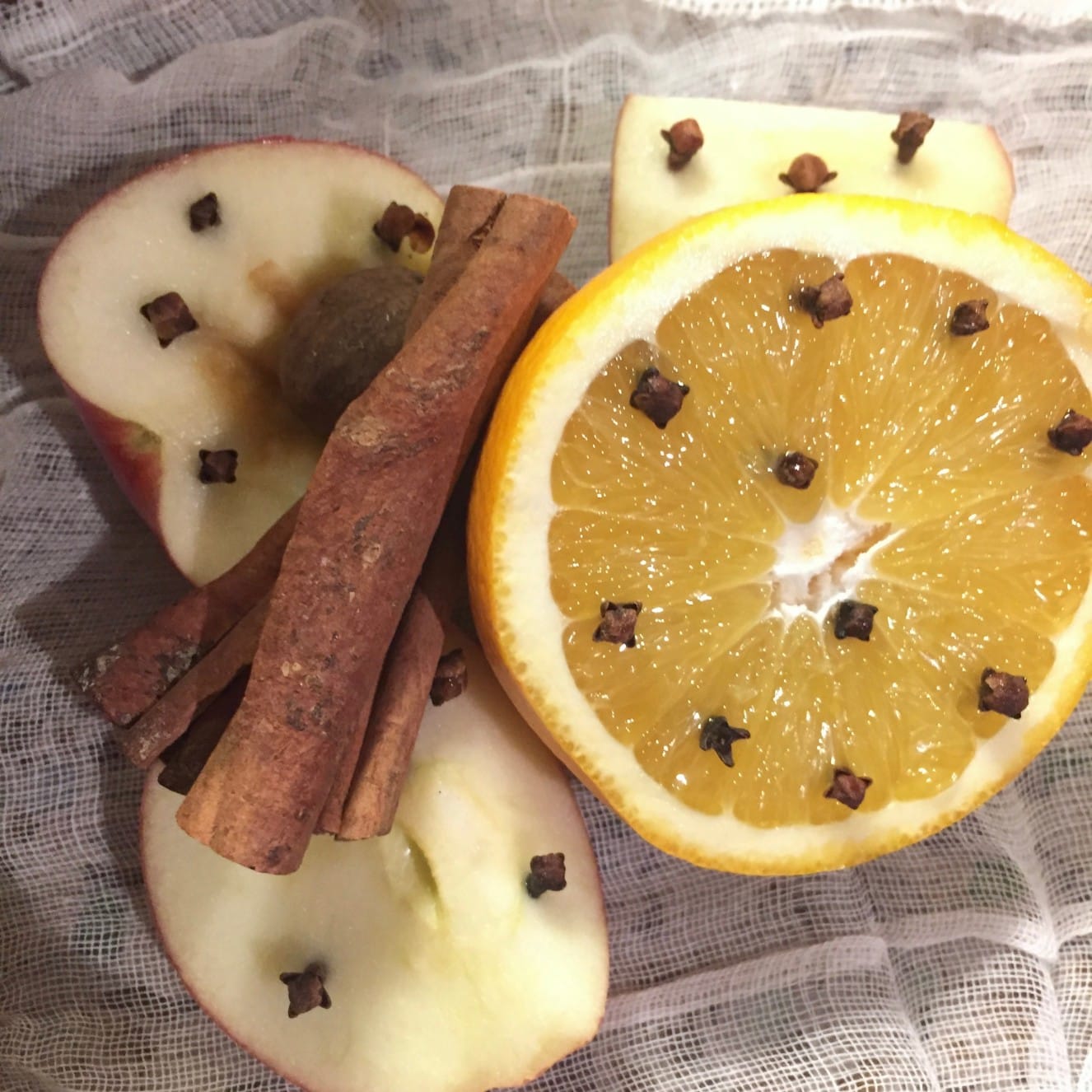 - Cut a large square of cheesecloth and place the orange, apple, cinnamon sticks and nutmeg inside. Tie it closed into a little bouquet.