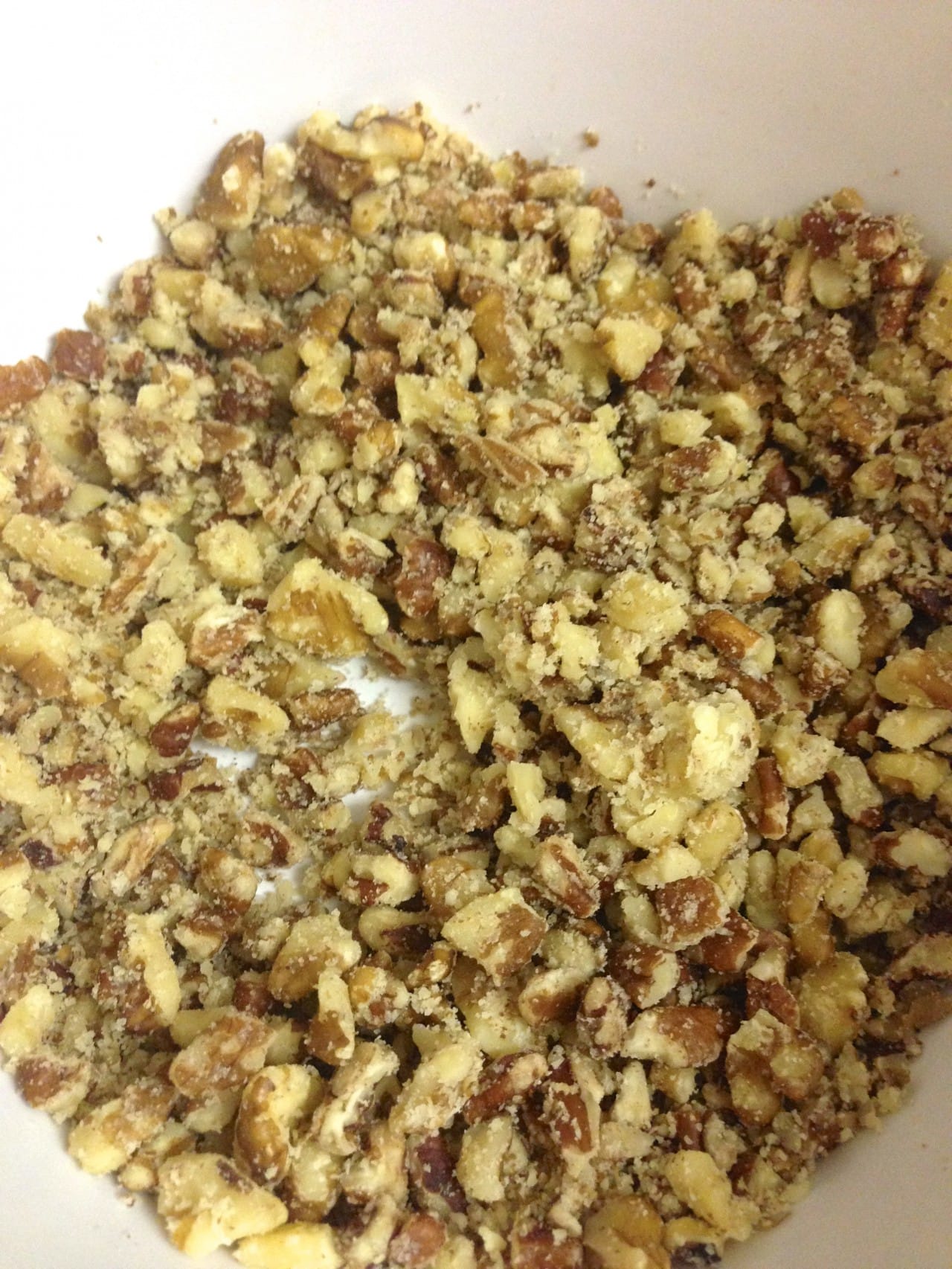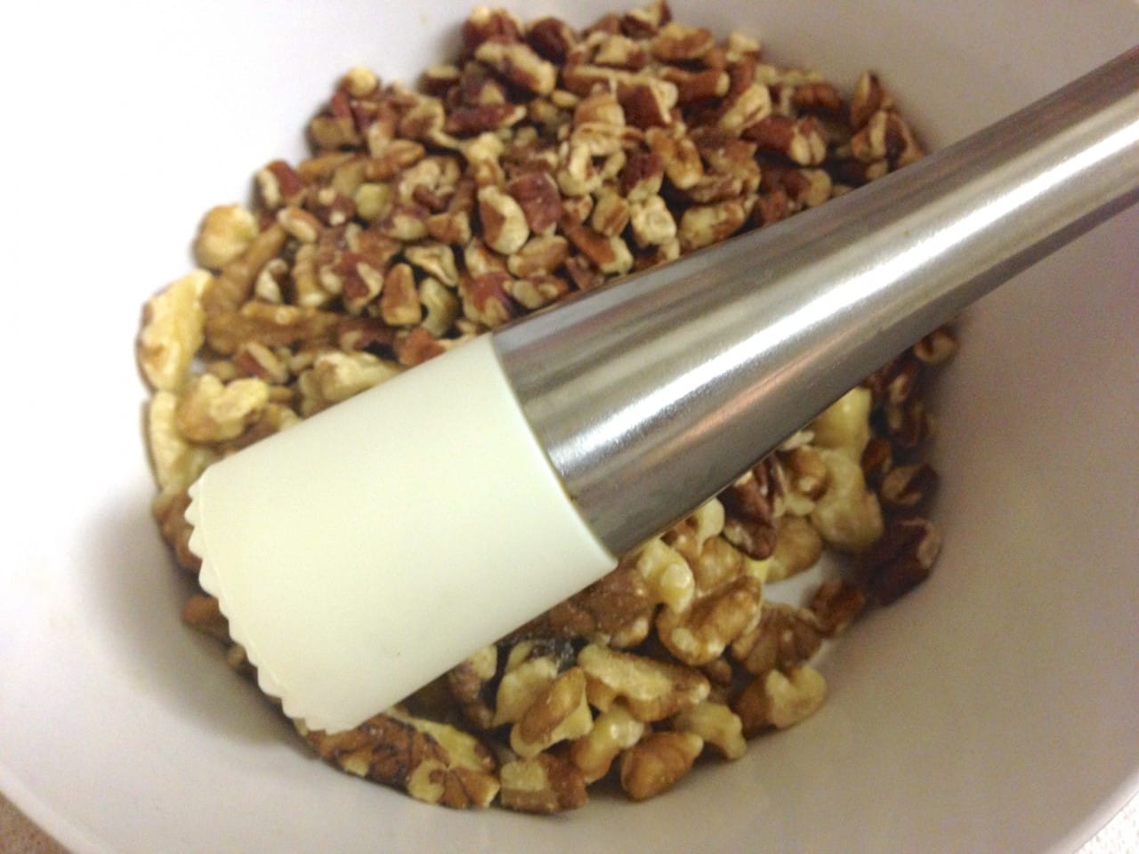 - In BOWL (not plate or you’ll make a mess!), smash your nuts! I used a muddler because it’s easy (and fun) and I didn’t feel like chopping the already small pieces even smaller. You can take the easier route and throw them in a food processor, but I was lazy and didn’t want another thing to wash. Plus, as I said, it was fun to smash them!