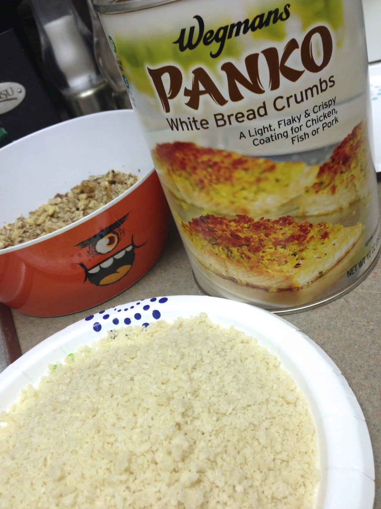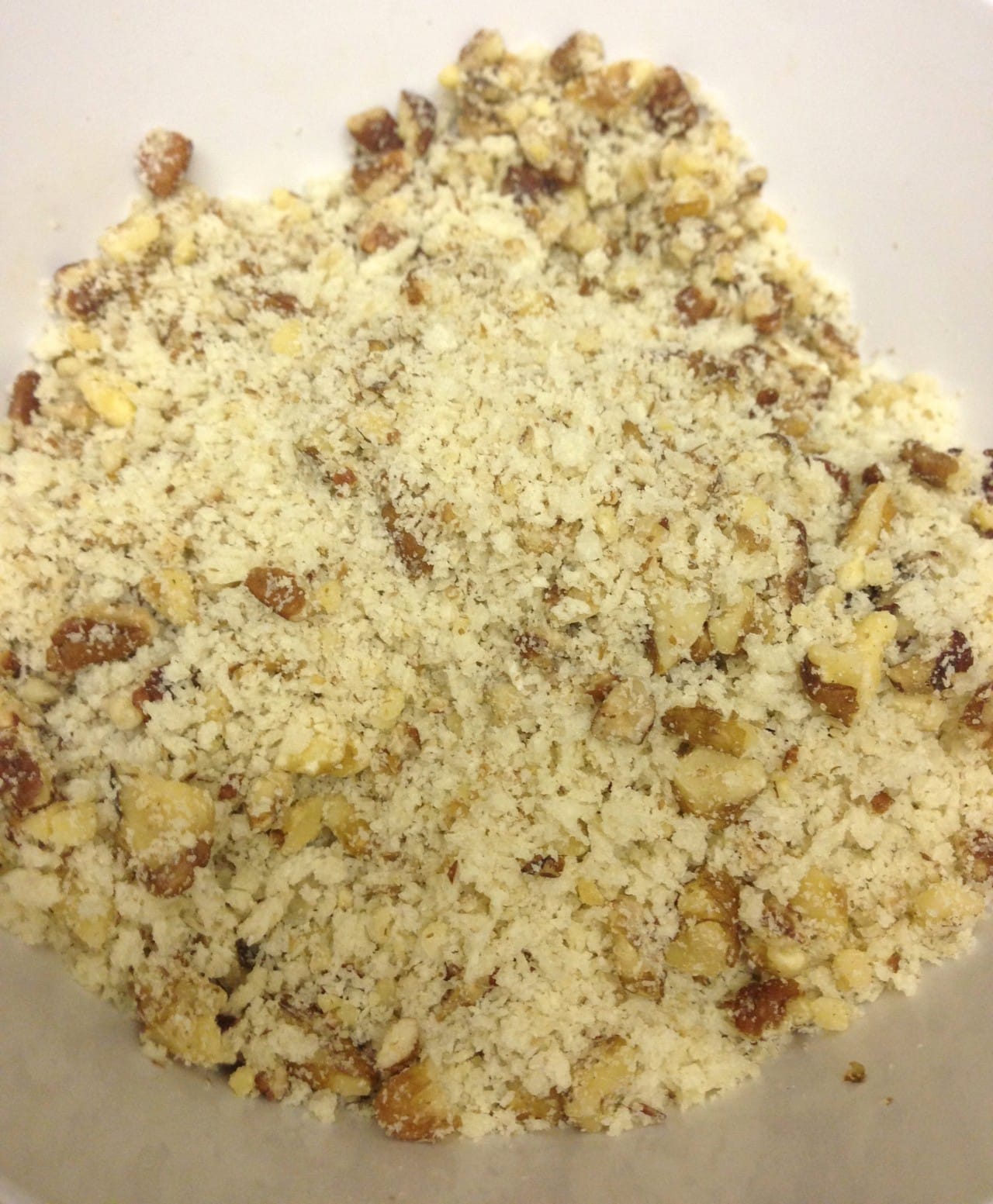 - Measure out your panko breadcrumbs and add them to the nut bowl. Mix together.