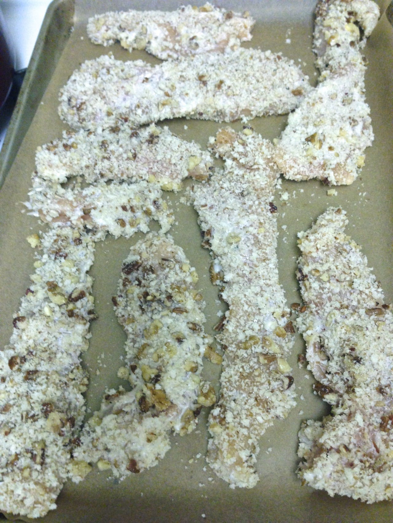 - Also in the original recipe, the amount of nuts and breadcrumbs is the same. This didn’t work for me- it always came out soggy. By increasing the amount of panko, it ensured the chicken came out crunchy. BONUS: I don’t have to spray the tops of the chicken with cooking spray to get them to crunch up like the original recipe recommends, since they already get plenty crunchy from the added breadcrumbs! If you want them a more golden hue, you may still include this step.