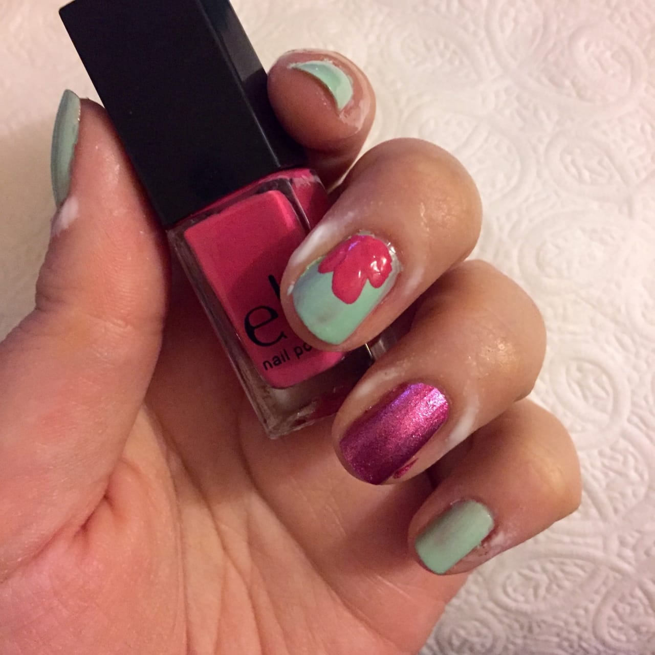 - Use your non-sparkly hot pink polish to make three quick petals. Remember, they do not need to be perfect! I did them on one hand coming out from the bottom of the nail, and on the other hand coming out from the top of the nail. Let completely dry.