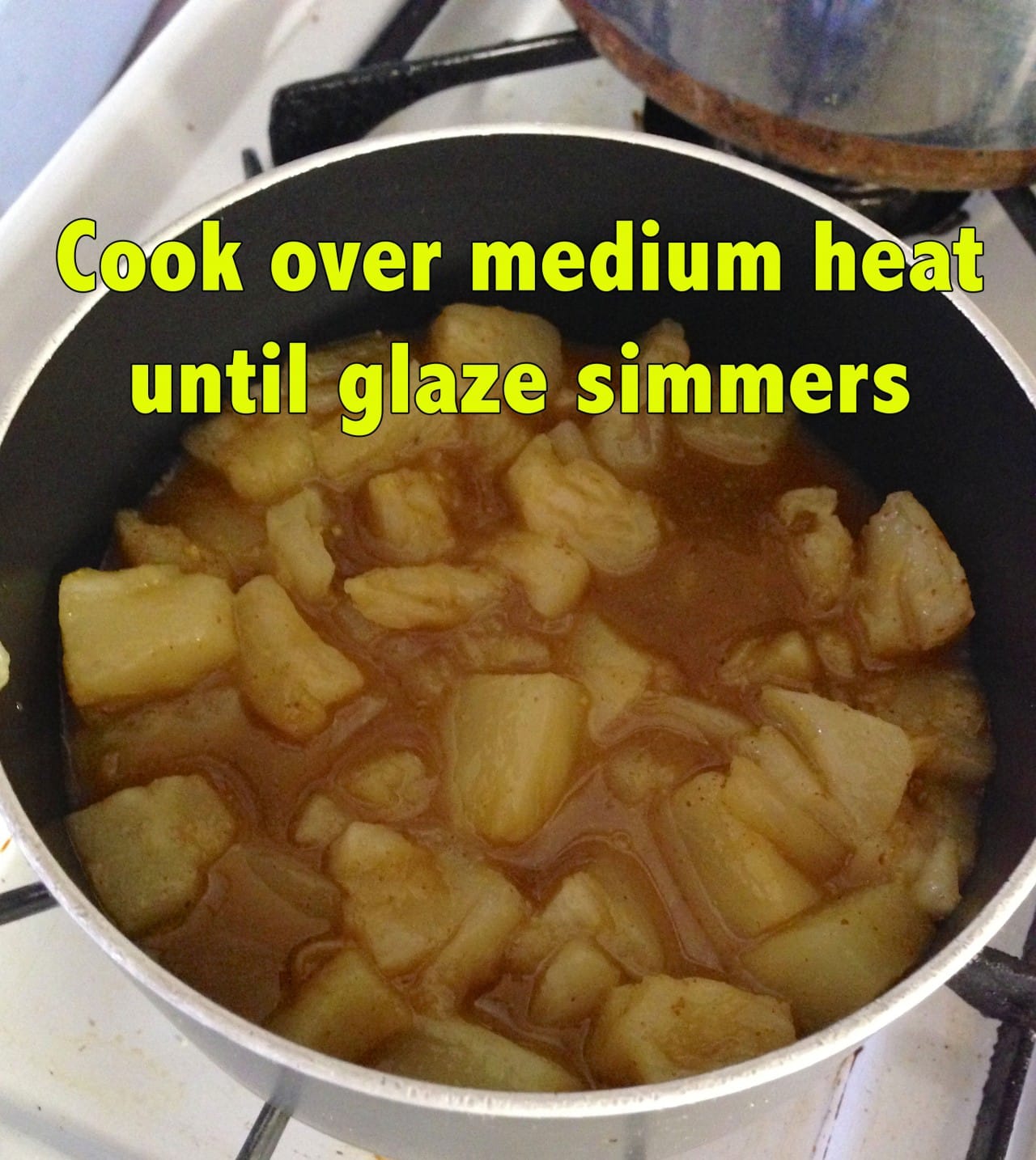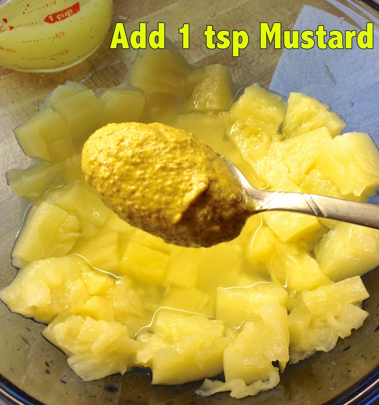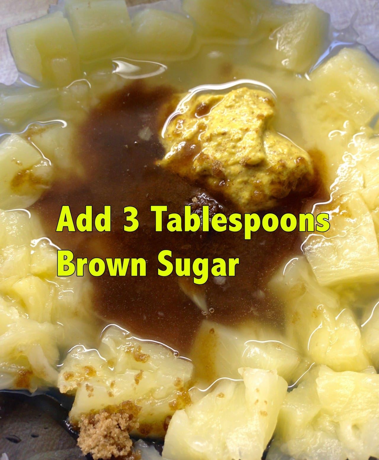 Add three tablespoons of brown sugar and one teaspoon of mustard to your pineapple chunks and mix. Use any mustard you like! Dijon was my mom’s favorite. I like honey mustard. My dad likes this mustard from the deli, so that’s what we used this time. Each different mustard gives the glaze a different flavor, but it’s always good!