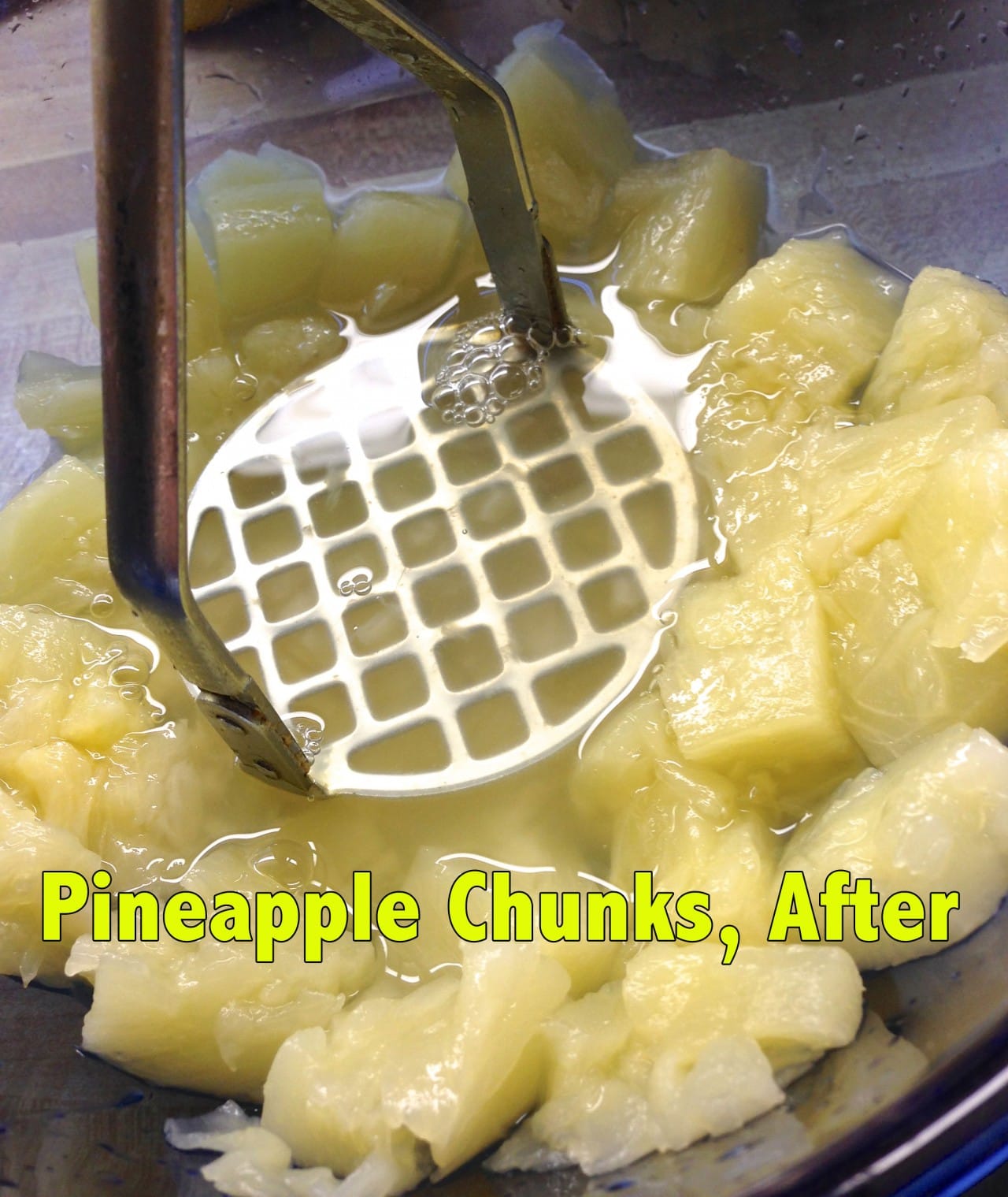 -Then I put the pineapple chunks into a bowl and used a potato masher to smash them up. It was fun! Very messy, though.