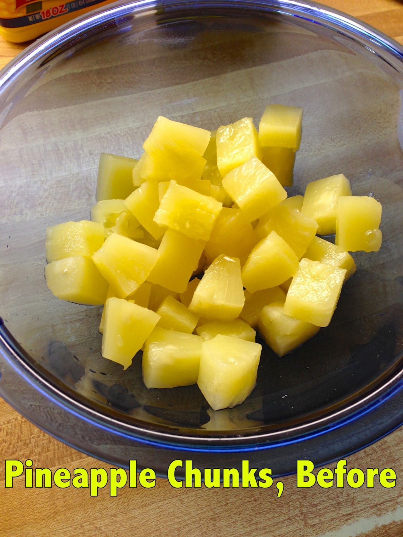 -First, I drained the chunk pineapples of the extra juice. When you mash them up, more juice will be created so you won’t need the extra juice that is already in the can. If your pineapples are already crushed, it’s mixed together and doesn’t need draining.