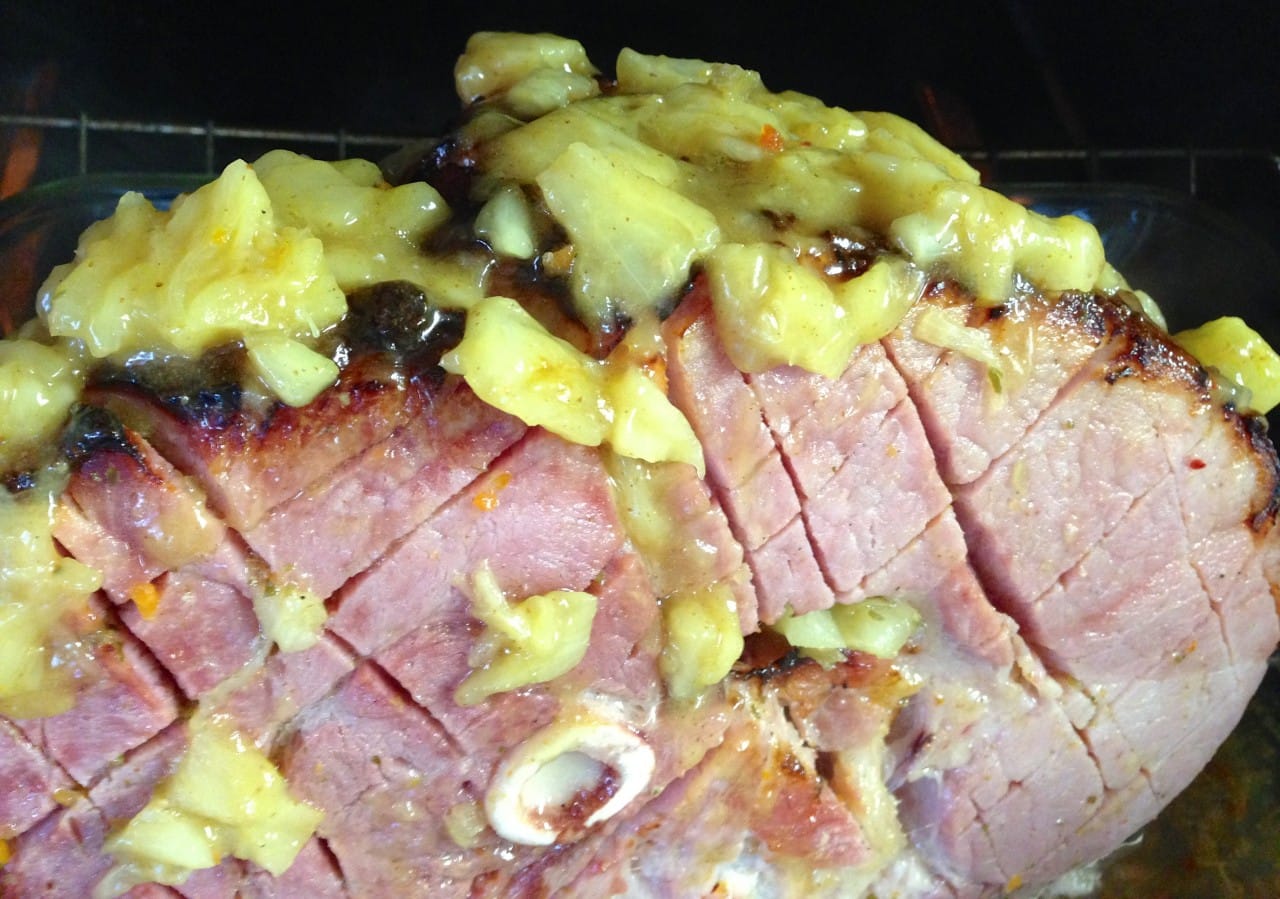When you’re happy with the thickness of your glaze, turn off the stove top because you’re DONE! Now it’s time to glaze the ham. Only use HALF of your pot, making sure to spread the glaze over each side. Let cook for 20 minutes.