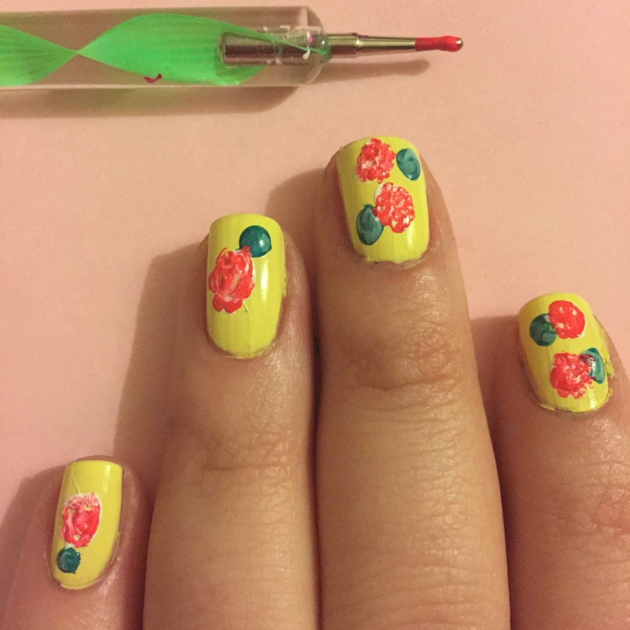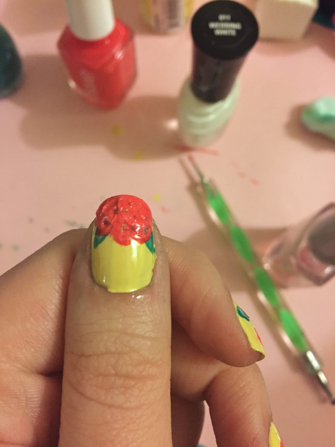 - I went back over all the nails with the dotting tool and pressed gently many times on each flower. If they weren’t going to swirl the way I wanted them to, they were at least going to be super texture-y, damnit!
