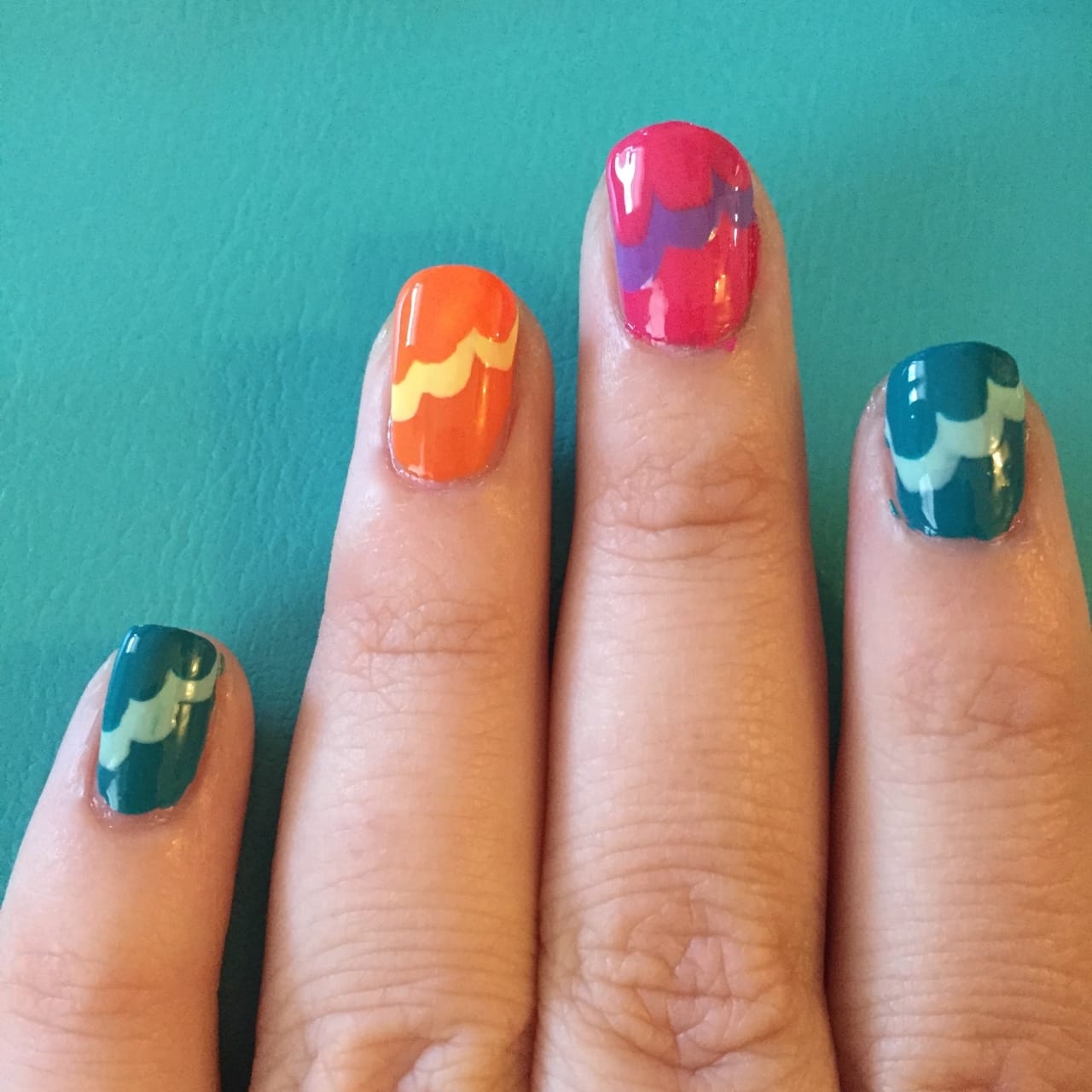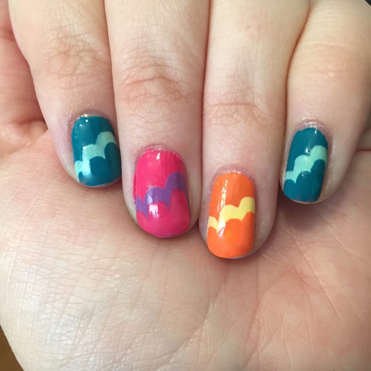 - Choose which of your colors will be featured more predominantly, and use that as your first color, painting the whole nail. I picked teal, orange and pink, alternating each nail. Let dry.