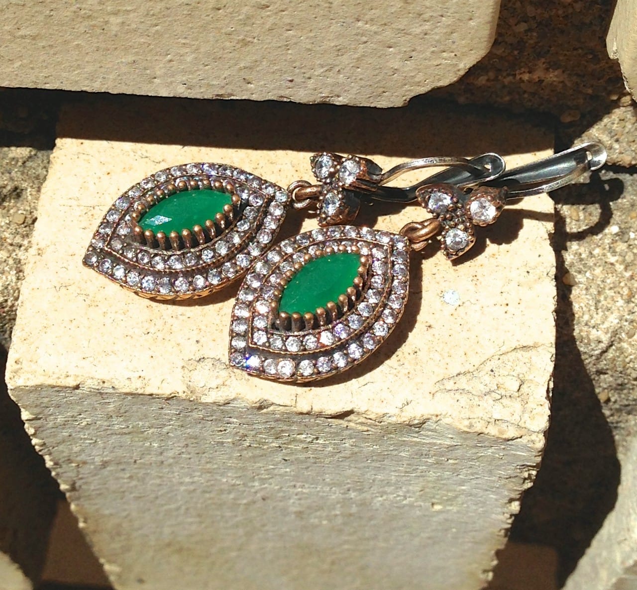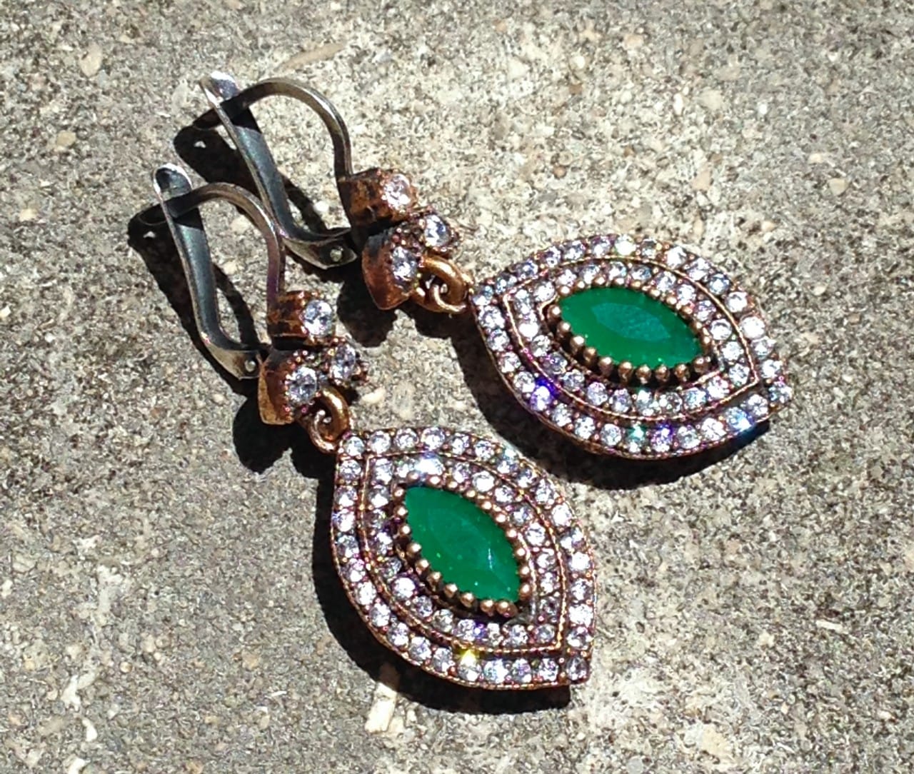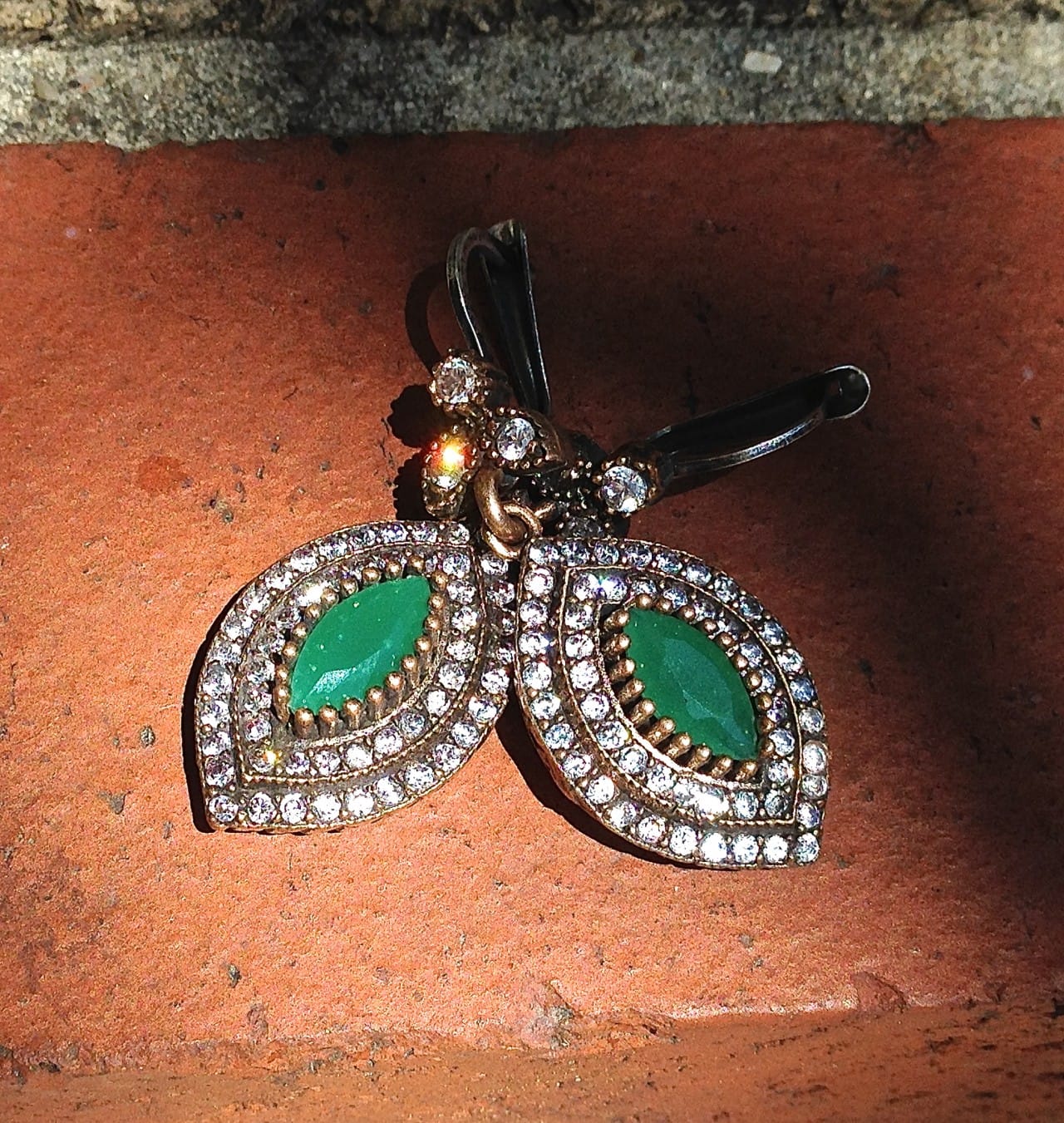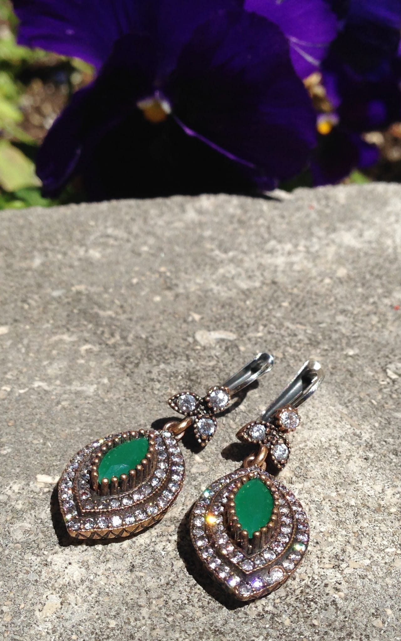 These amazing Turkish style earrings measure at just about two inches in length and are comprised of sterling silver, and Emerald and cubic zirconia stones. They have a good weight to them- usually earrings of this size are way too heavy for my ears, but these aren’t. They are very comfortable to wear, too!