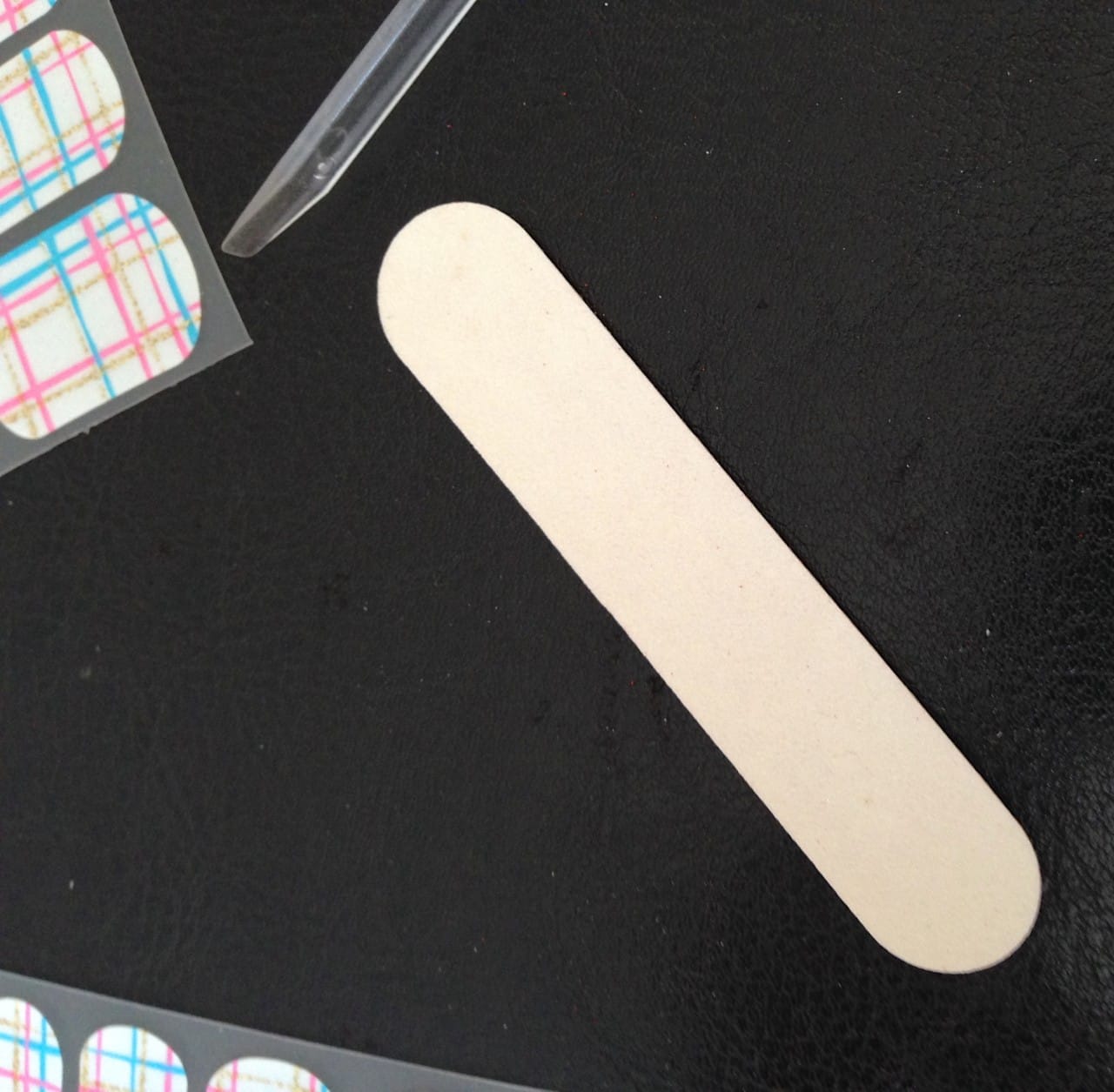 In the package you received 18 appliqués in different sizes, a small plastic cuticle stick and a “mini file and a buffer.” I didn’t see any buffer in my package, so I assume they refer to the other side of the nail file as the buffer- even though both sides very much felt the same. Still, I followed the directions and washed my hands. Then I filed them with one side and buffed them with the other (see below).