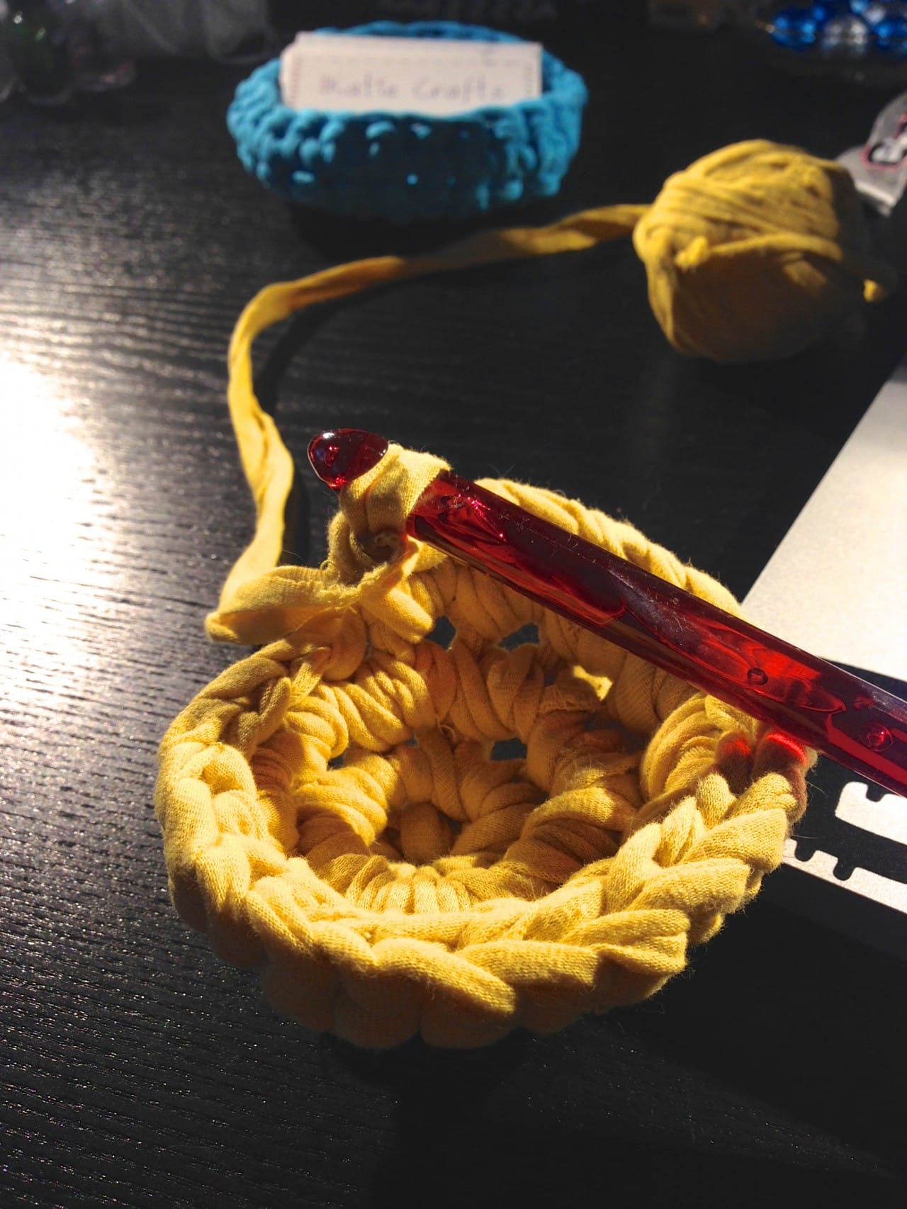 These small crocheted bowls use the t-shirt yarn I made last week, and are shallow and flat enough to hold things like my hair pins, business cards and more. I can’t wait to get a little shelf for the desk that I can line these pretty little guys up on! They are certainly adorable and I’ll surely be making more! Did I mention they are also a great beginner project for someone who wants to work in rounds?