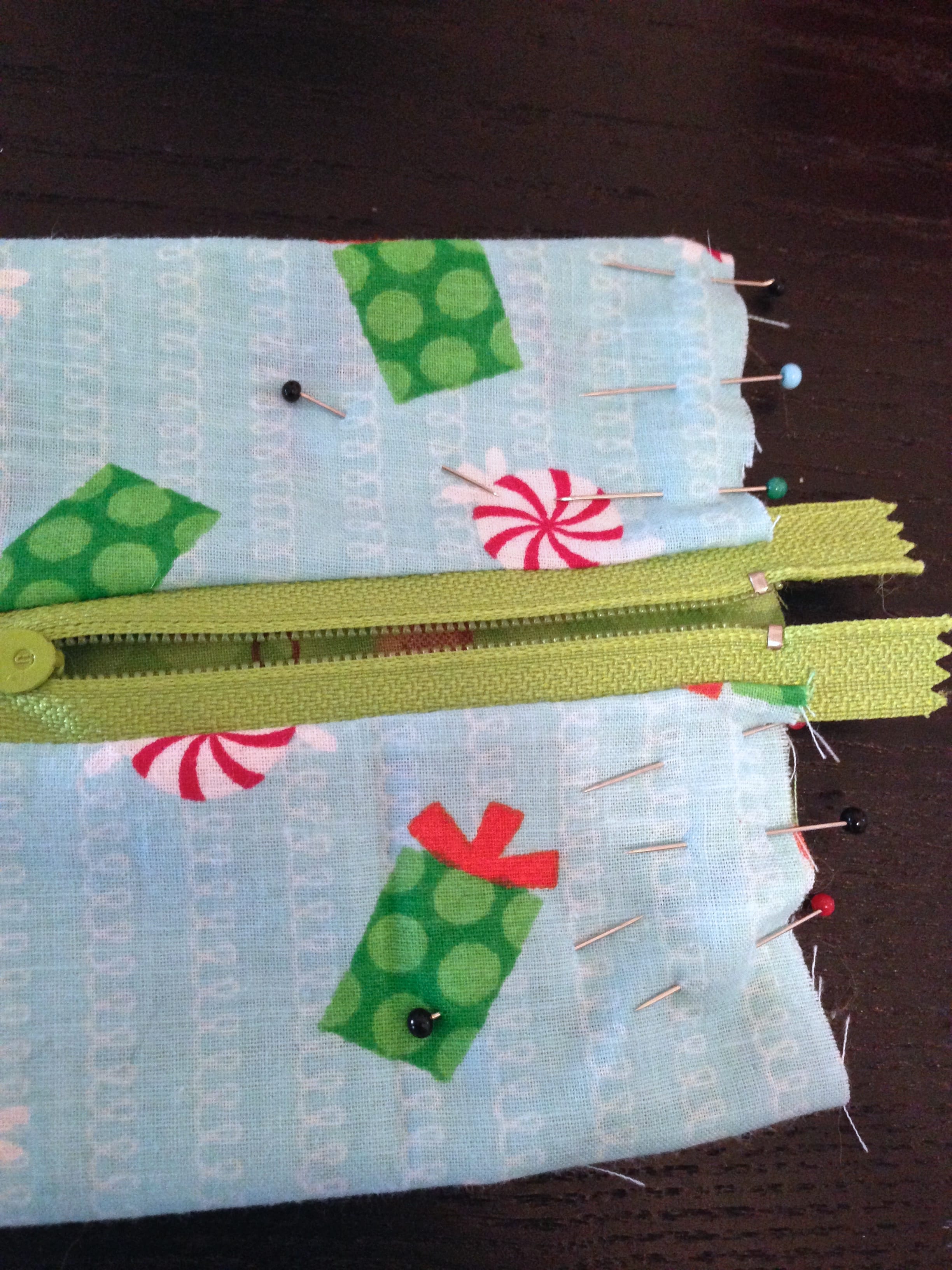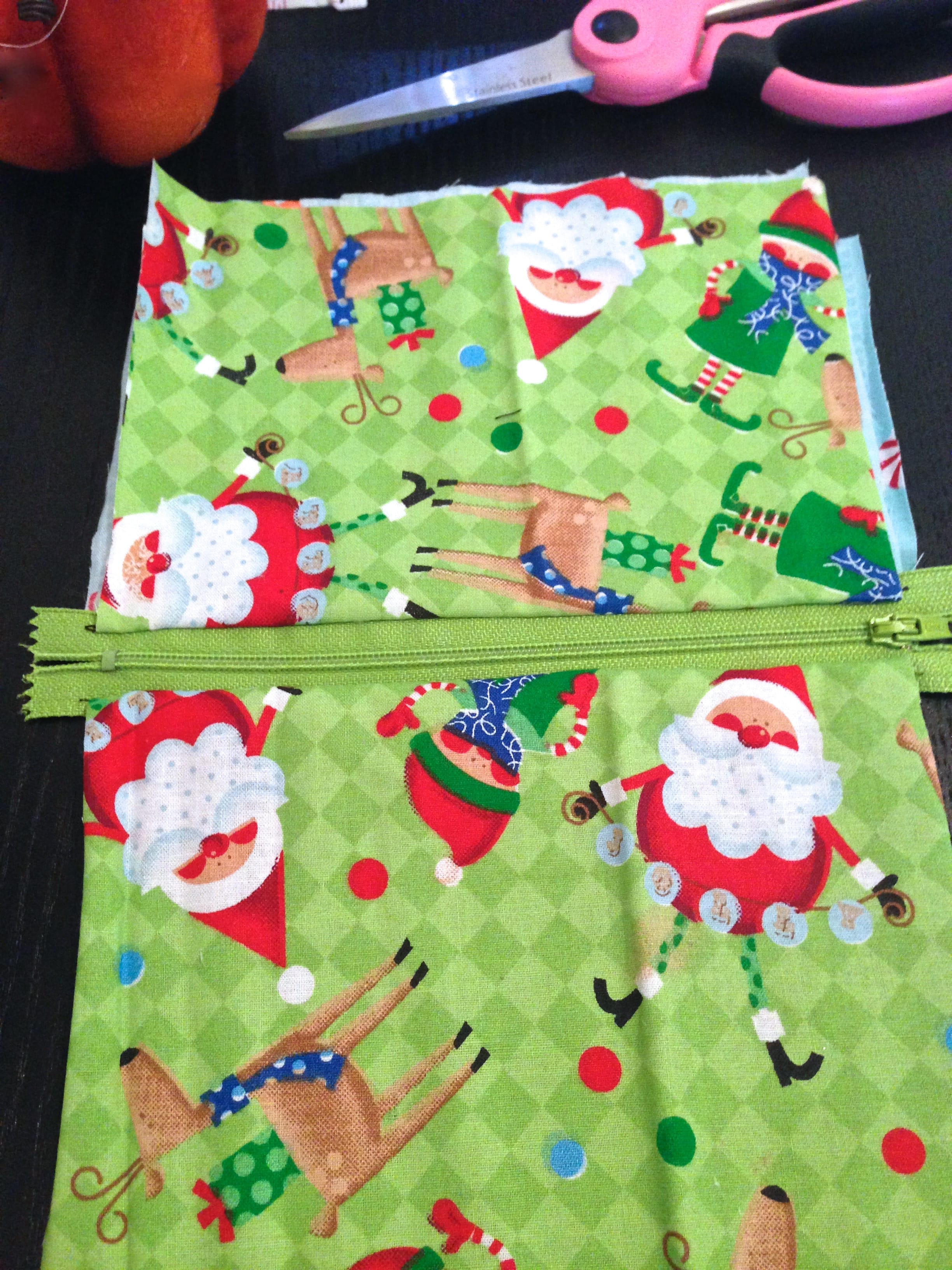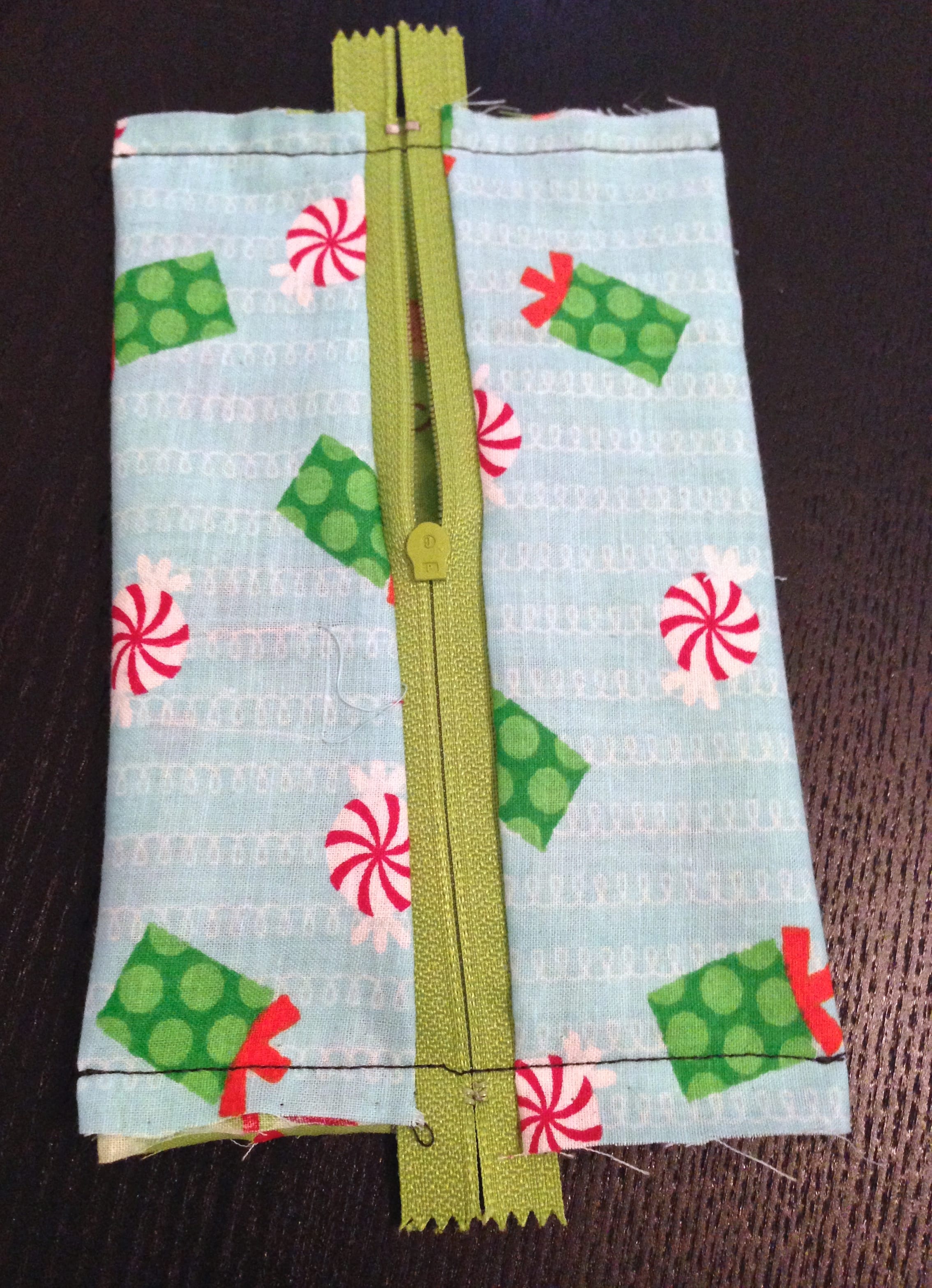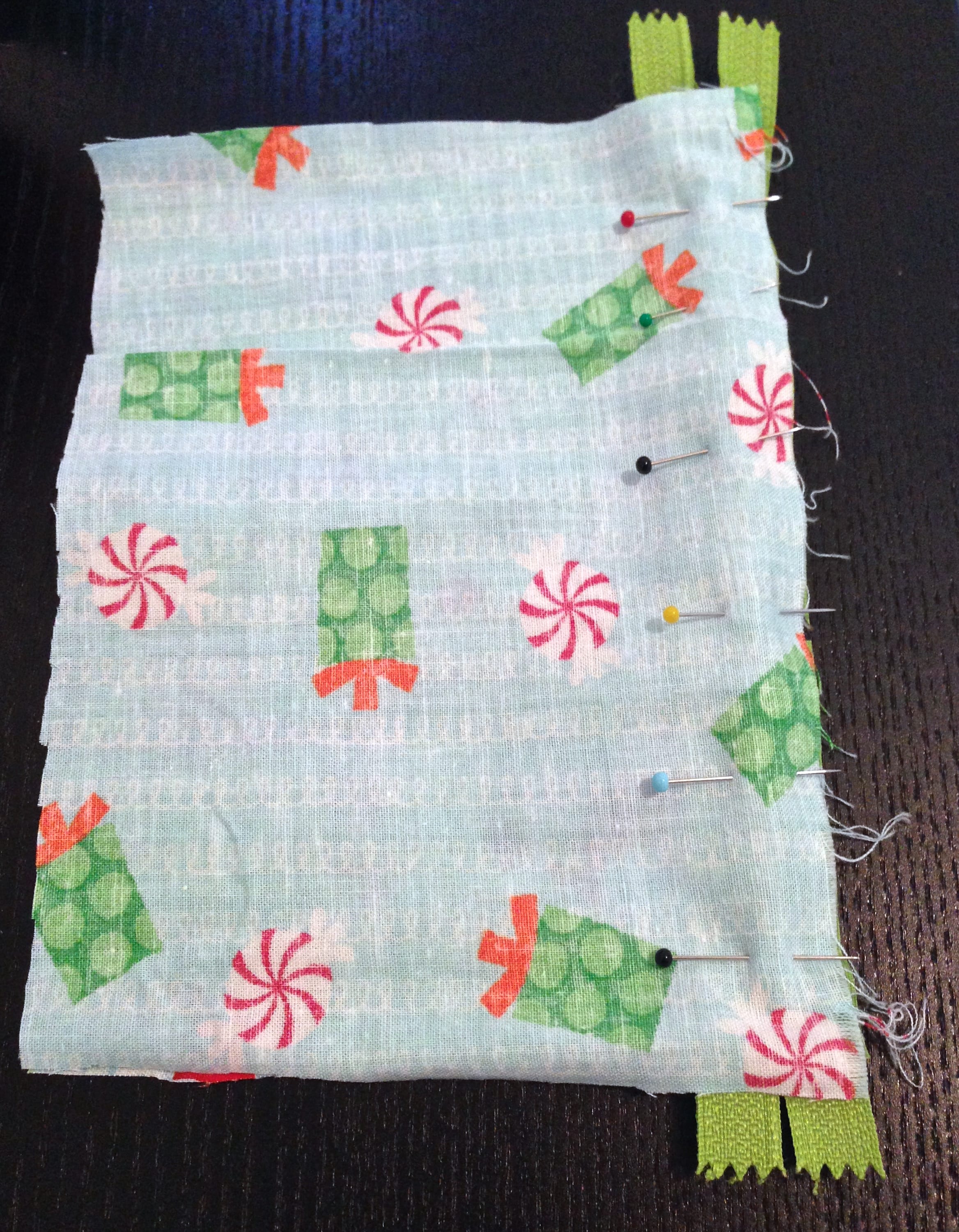 - Lay one interior fabric panel right side DOWN on top, making a neat little zipper sandwich.