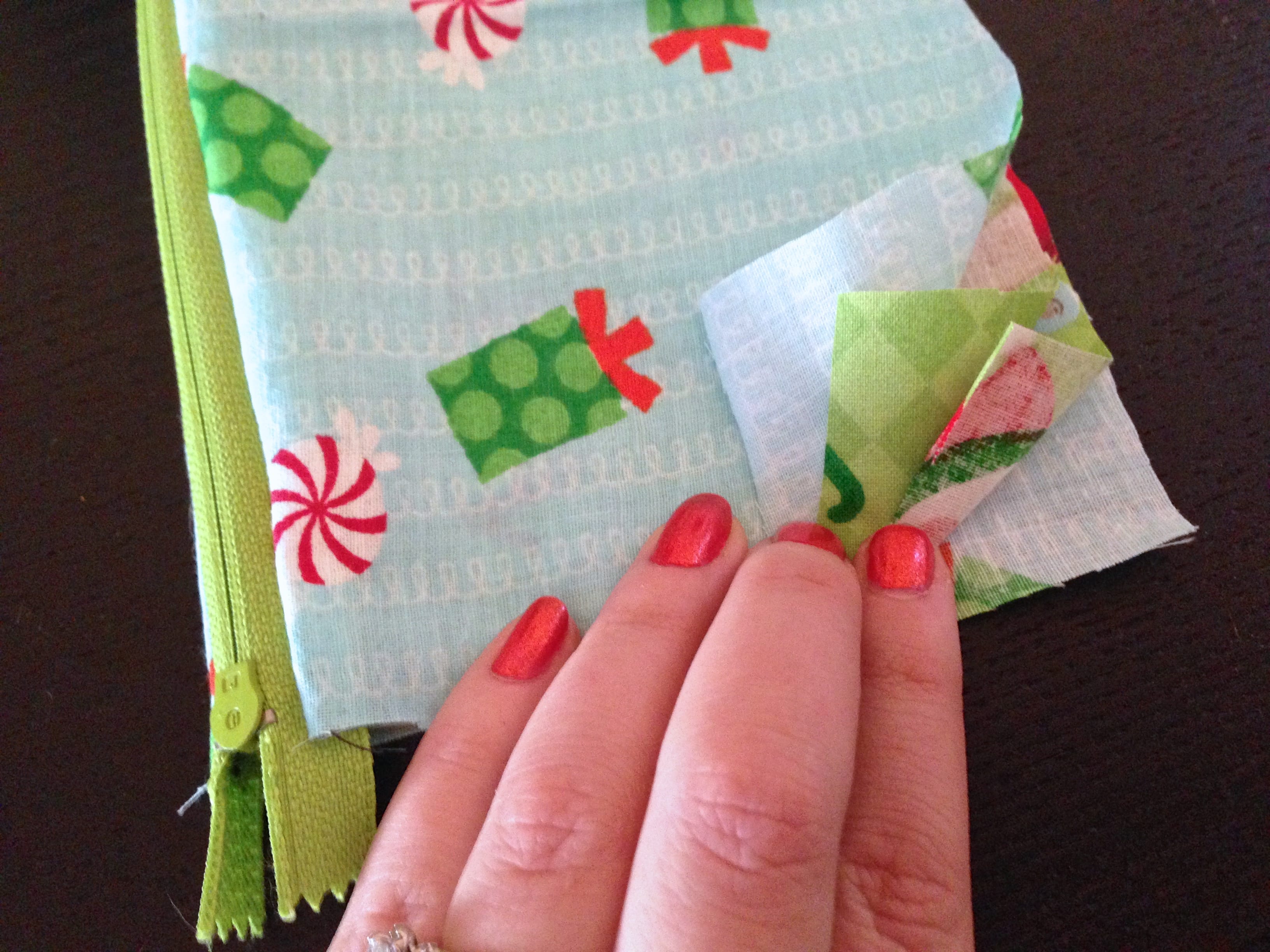 On the third day of Christmas, I decided it was time to whip out the sewing machine! This mini makeup bag will fit in any purse and make a great gift for holding your hair accessories, mascara, trinkets and more.