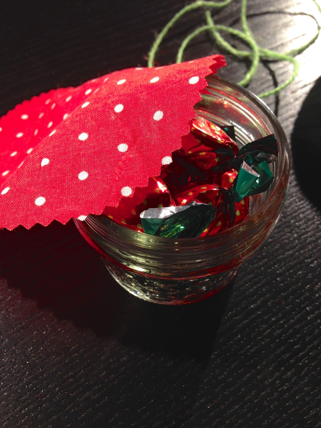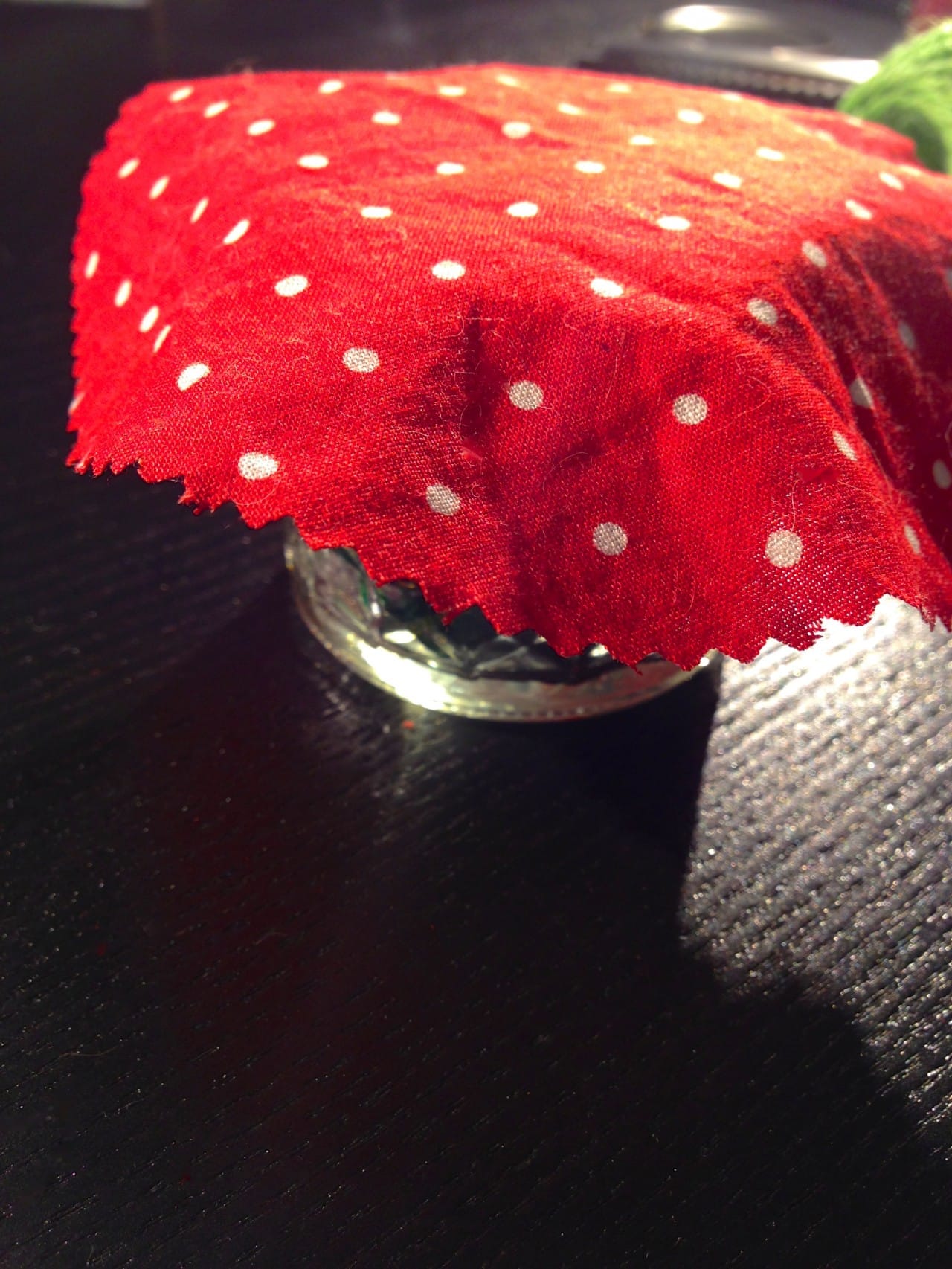 - Place the fabric circle centered over the top of the jar, and screw the outside portion of the lid right on top of the fabric.